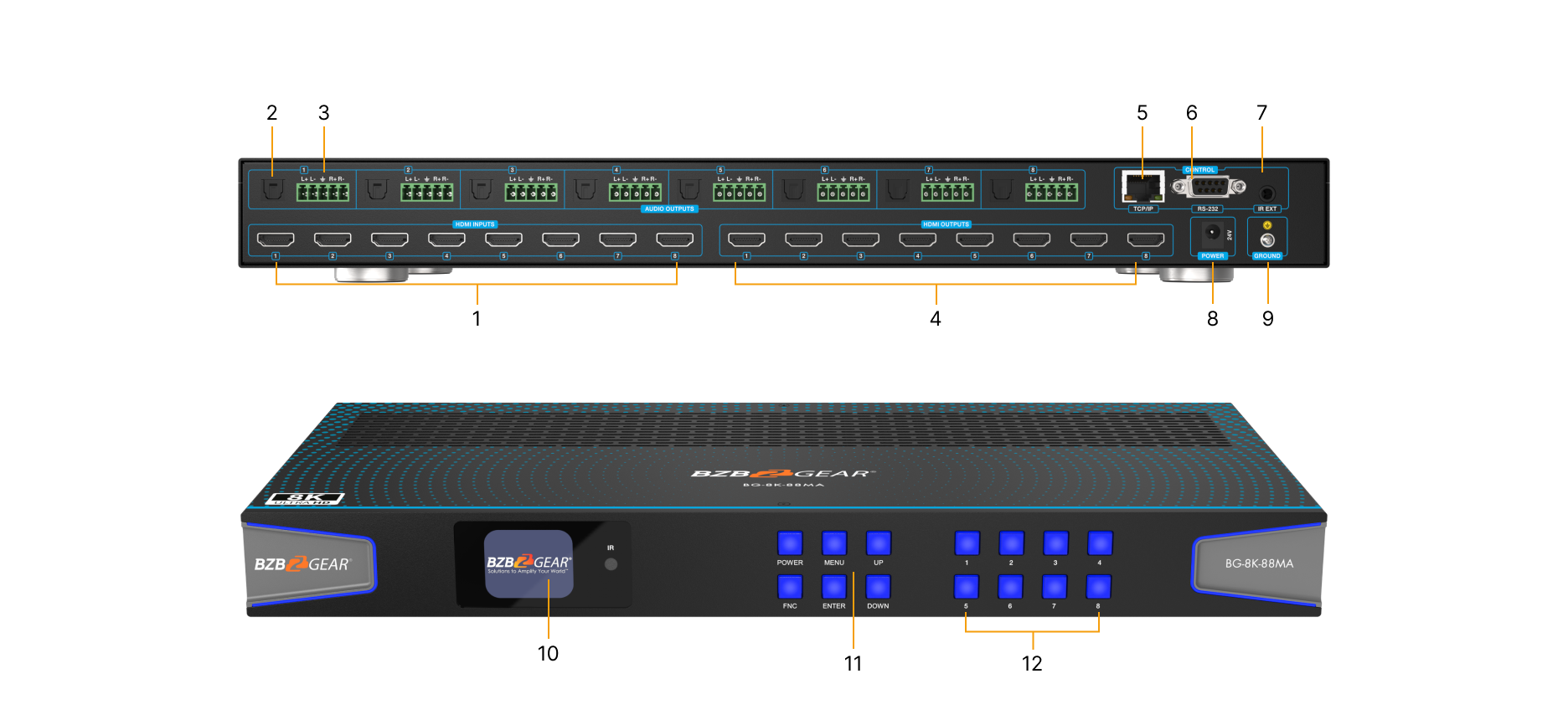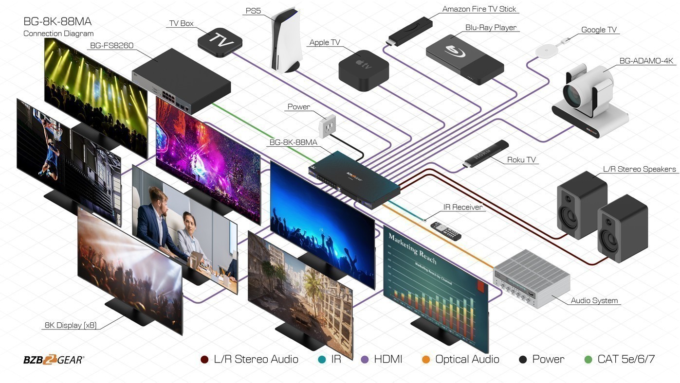 | Output ports | 8 x HDMI [Type A, 19-pin female] 8 x S/PDIF Optical 8 x Balanced Stereo Audio [3.81mm, 5-pin Phoenix Connector] |