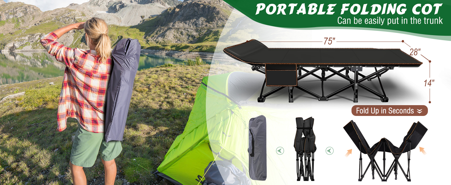 Easy to Setup: No assembly required, incredibly quick and easy to set up. Easily fold up the small camping cot within 10 seconds and store it into carry bag. Fold up to fit inside most car trunks.