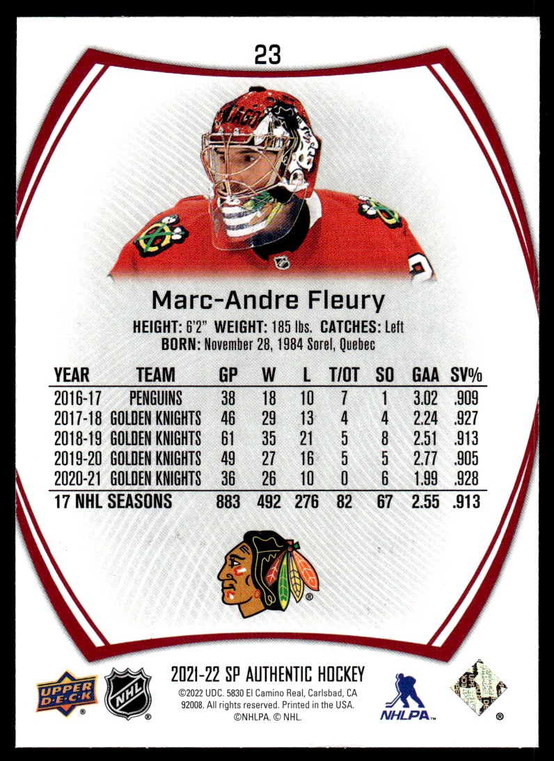 2021-22 UD SP Authentic Limited Marc-Andre Fleury Chicago Blackhawks #23