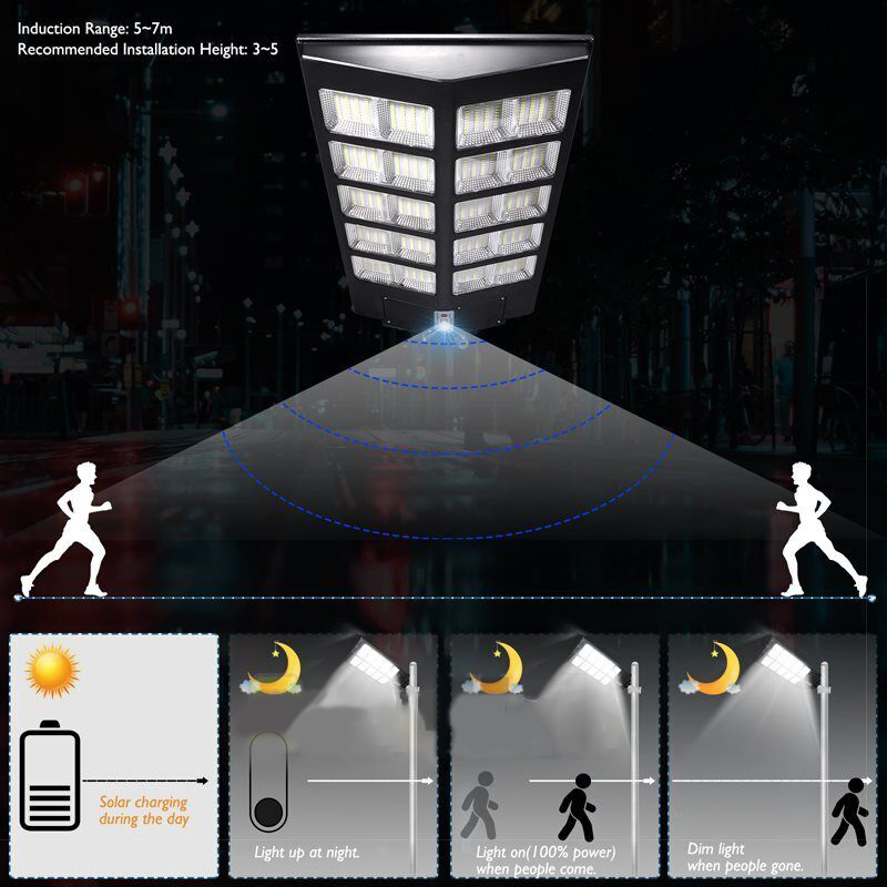 【220° solar panel design and wide-angle lighting】 We have upgraded the solar panel and it has two-way wide-angle lighting, the lighting angle reaches 220°, and benefits from super bright led beads, allowing it provide a wider range of lighting and brighter light compared with ordinary 180° street lights. Illumination area up to 1600-1900sq.ft, we recommended installation height:6-8M.It can be lighting up street and offer convenience for walking at night.