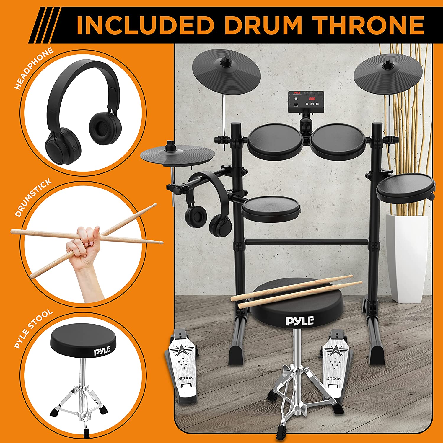 • 8-PIECE PROFESSIONAL KIT: The Electronic Drum Kit comes w/ everything a drummer needs to play like a pro! The drum set includes 8” tom pads, 8” mesh snare pad, 10” crash cymbal, 10” ride cymbal, 10” hi-hat cymbal, digital foot pedals & drum sticks