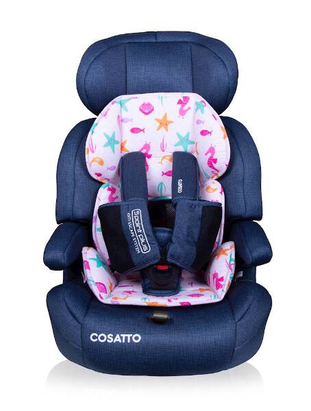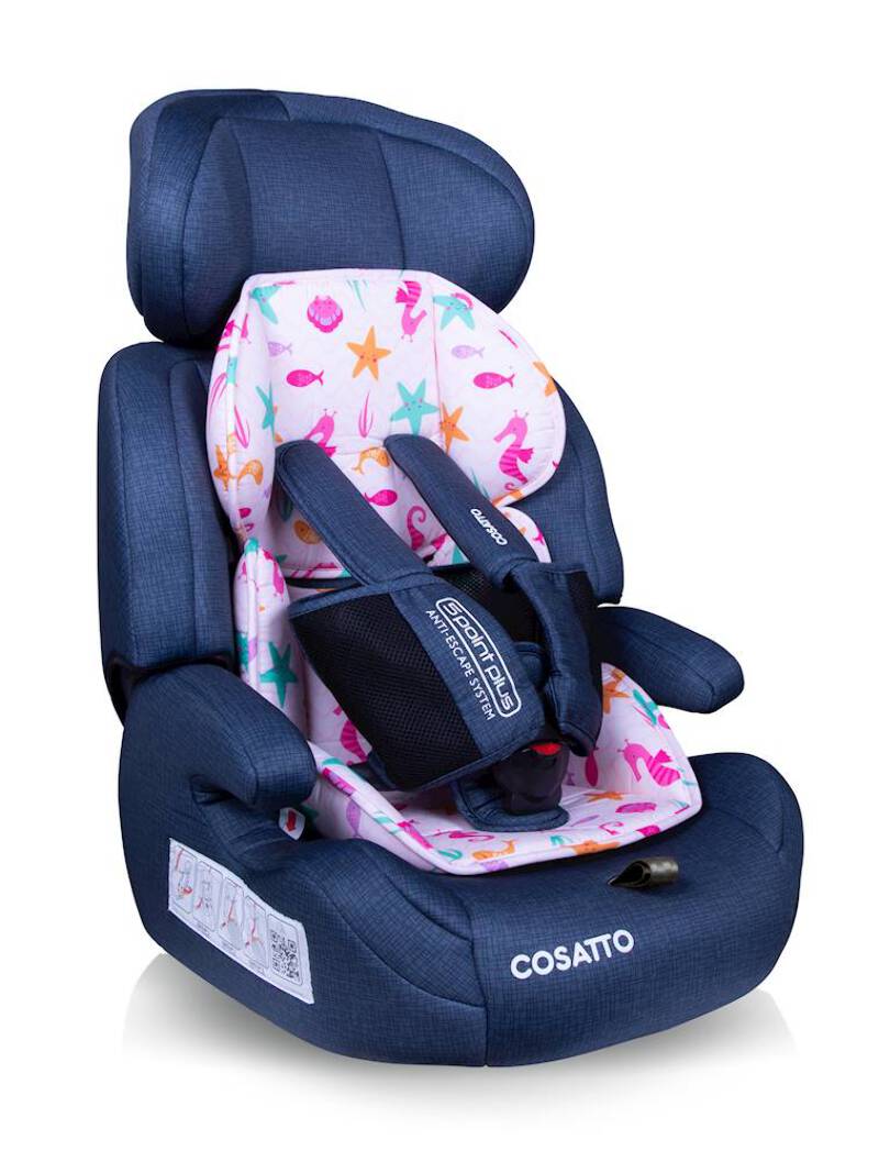 Cosatto Zoomi car seat has a five-point safety harness with quick release buckle for home time. With layers of padding plus tummy pad, chest pads and comfy padded arm rests, this toughie's a softie too.