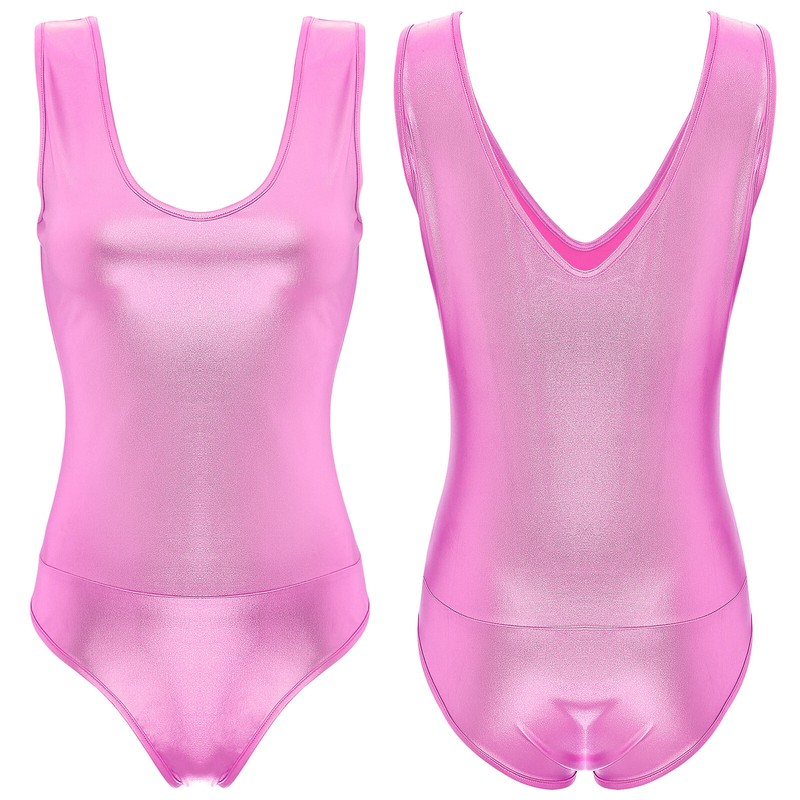 Sleeveless bodysuit for women, u neck, back with cutout design, glossy surface, simple but stylish.