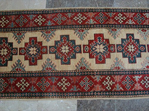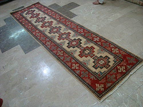 Super Kazak Caucasion Afghan Tribe Vegetable Dyed Ghazni Wool Hand Knotted Runner Rug (9.5 x 2.7)'. Kazak is a modern shape of old Caucasian rugs which strictly adheres to traditional design elements of the Caucasus. It has elements such as the stepped hooked polygons, geometrical medallions and rosettes, presented in more stylized manner and with a new dimension. Natural dyes produce soft luminous shades and abrashes causing a beautiful sheen. Handspun woolen yarn is normally used in the variety of vibrant warm colors. Kazaks rugs in our collection are all fine quality pieces from Afghanistan made with Ghazni handspun wool and natural dyes. 100% Genuine Hand Knotted-Rug not hand tufted.