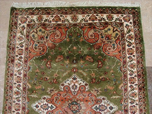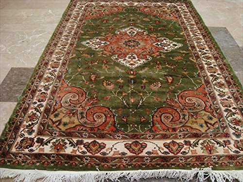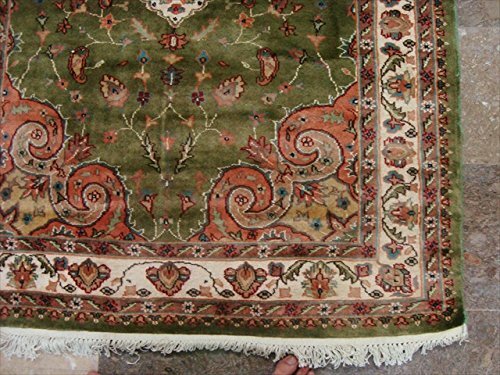Lovely Olive Green Medallion Rectangle Area Rug Hand Knotted Wool Silk Carpet (6 X 4)'. Add a classic look in your home with this rug. For the perfect combination of unique, beautiful style and high-quality durability, the attention to detail on these beautiful contemporary rugs is noticed as soon as you lay eyes on the carpet. The rug to appear dull when viewed from one side, and shiny from the other side. Please view the picture at the bottom to see the bright side of the rug. This rug can help brighten up a room if you do not get much sunlight. Simply put the bright side facing the seating area and it will make the room appear surprisingly bright. Blended color schemes match well with all styles of furniture and art. Give your home an elegant touch with this area rug. Great for any decor, adds texture to the floor and complements any decor. 100% Genuine Hand Knotted-Rug not hand tufted.