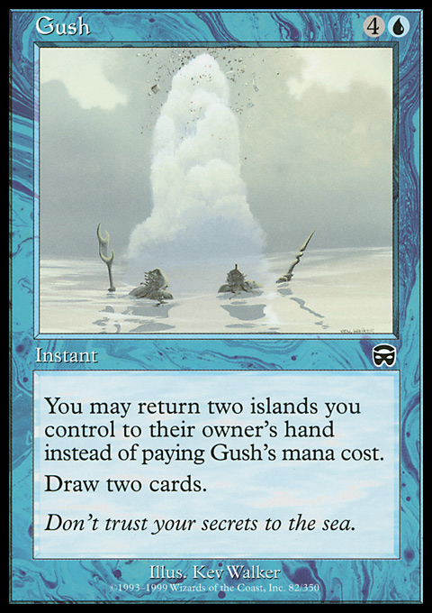 | | Name: | Gush | | Set: | Mercadian Masques | | Number: | 82 | | Condition: | Lightly Played (Excellent) | | Language: | English | | Variation: | Non-Foil | |