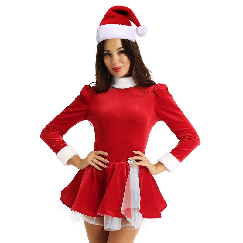 Women Christmas soft velvet leotard dress with concealed back zipper closure for easy wearing.