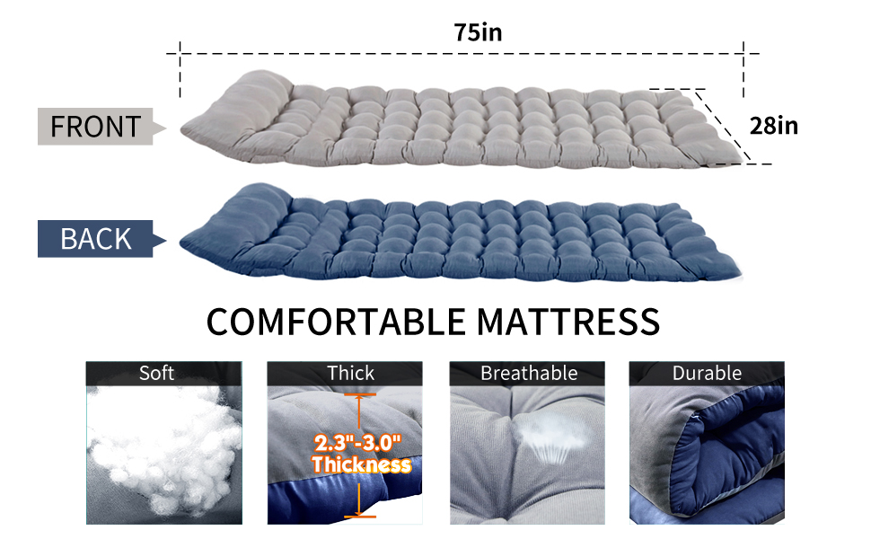 The heavy duty wide sleeping cot for adults measures 75"* 28"*16/14" when open, folded dimension is 41.3'' * 9.8/7.8''. The thicker sleeping cot bed ensures single person freedom movement in using.