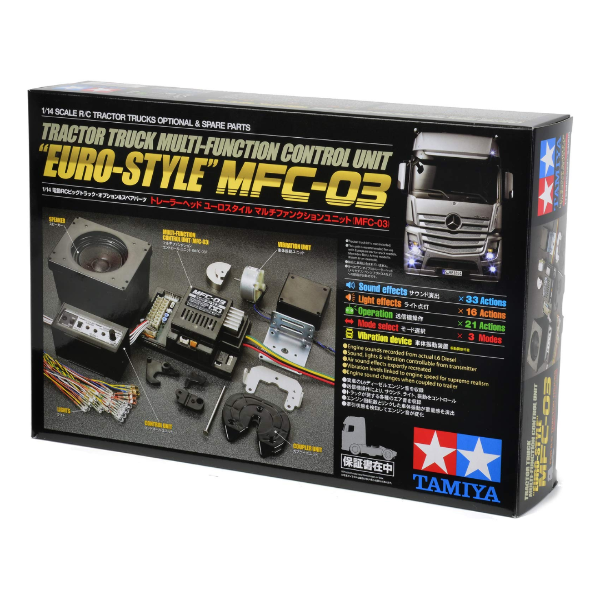 The Tamiya MFC-03 Multi-Function Control Unit brings unparalleled realism to your 1/14 scale Euro-style R/C tractor truck. It combines synchronised engine sounds, lights, and vibration effects with precision control, creating an immersive driving experience that mirrors real diesel-powered European trucks.