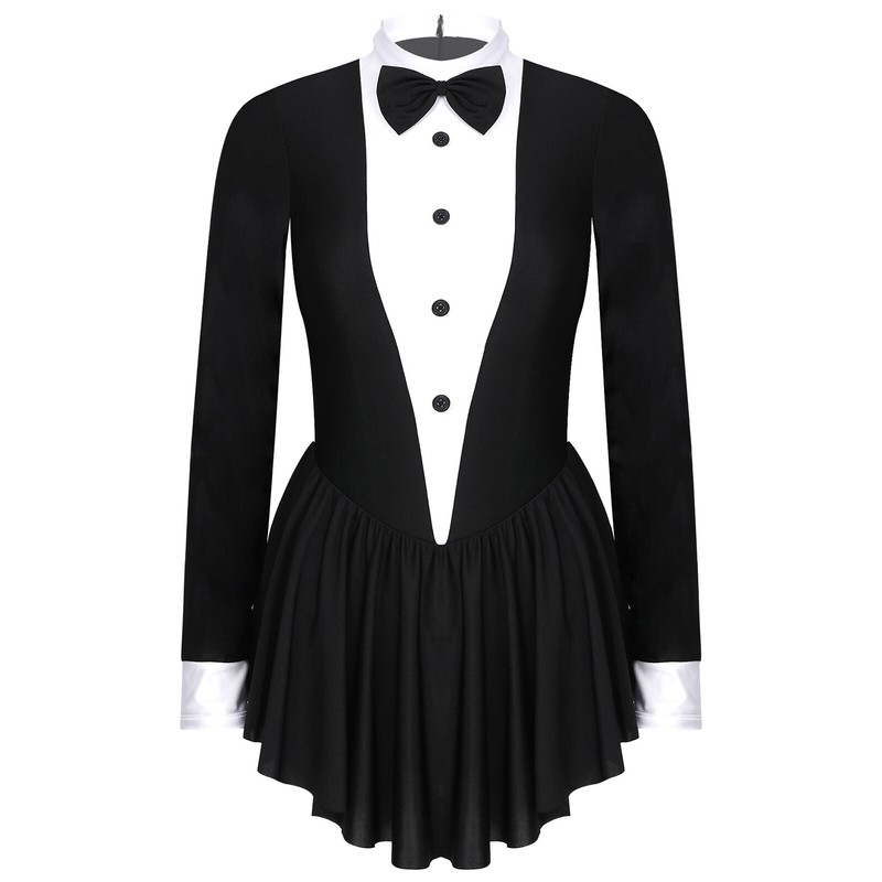 Tuxedo dress with ruffle skirt and built-in briefs to make you look more attractive. Invisible zipper on the back for easy wearing.