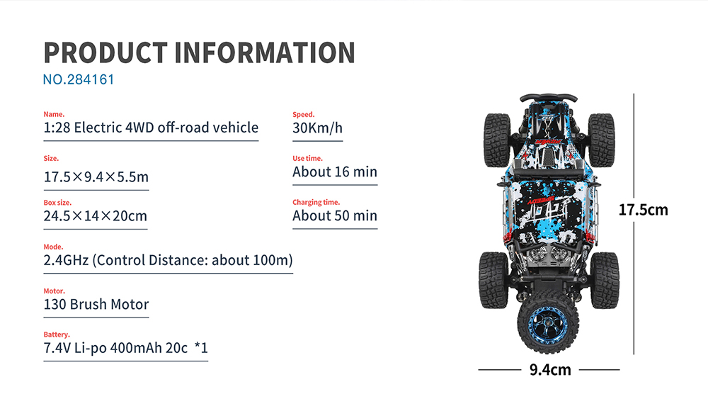 Looking for a high-speed, adrenaline-pumping mini RC car? Look no further than the WLtoys RC Car 1/28 284161! This 2.4G racing car is built for speed and agility, with a sleek design that will turn heads on the track. With easy-to-use controls and powerful performance, this remote control car is perfect for both beginners and experienced racers alike. So why wait? Get your hands on the WLtoys 284161 and experience the thrill of the race today!