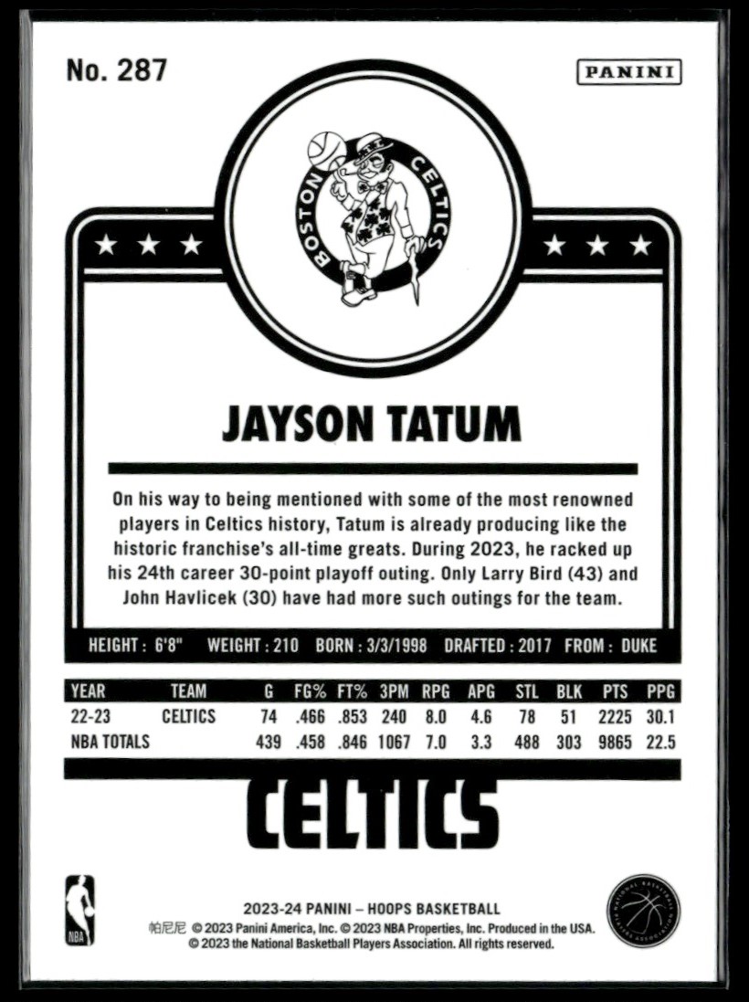 | 2023-24 Panini NBA Hoops Tribute BASE Jayson Tatum Boston Celtics #287 |