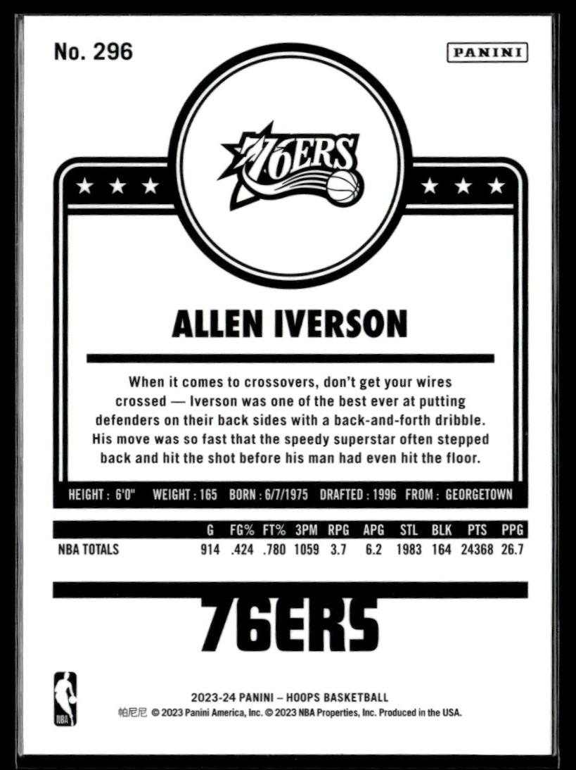 | 2023-24 Panini NBA Hoops Tribute BASE Allen Iverson Philadelphia 76ers #296 |