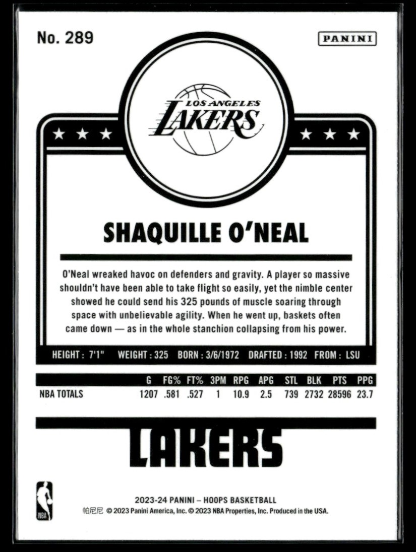 | 2023-24 Panini NBA Hoops BASE Shaquille O'Neal Los Angeles Lakers #289 | ||||||||||||||||||