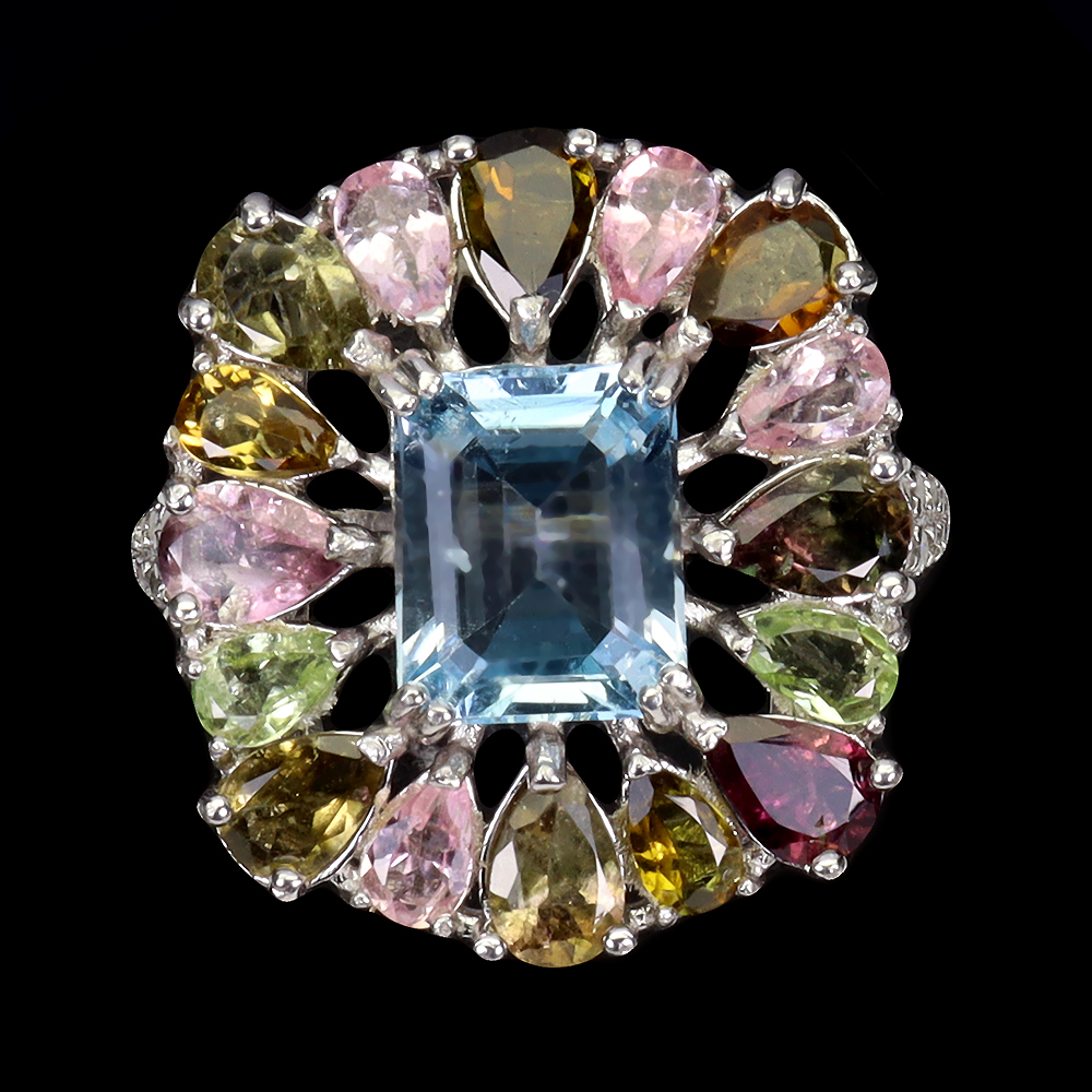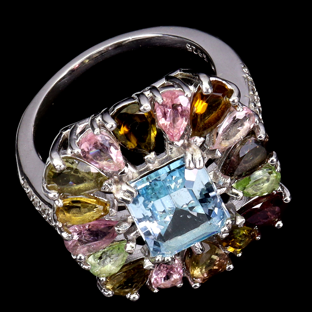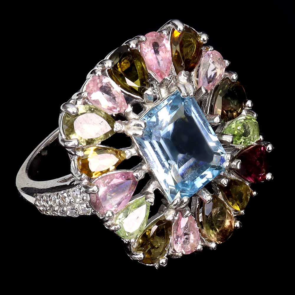 Irradiated Octagon Sky Blue Topaz 10x8mm Tourmaline 925 Sterling Silver Ring 8