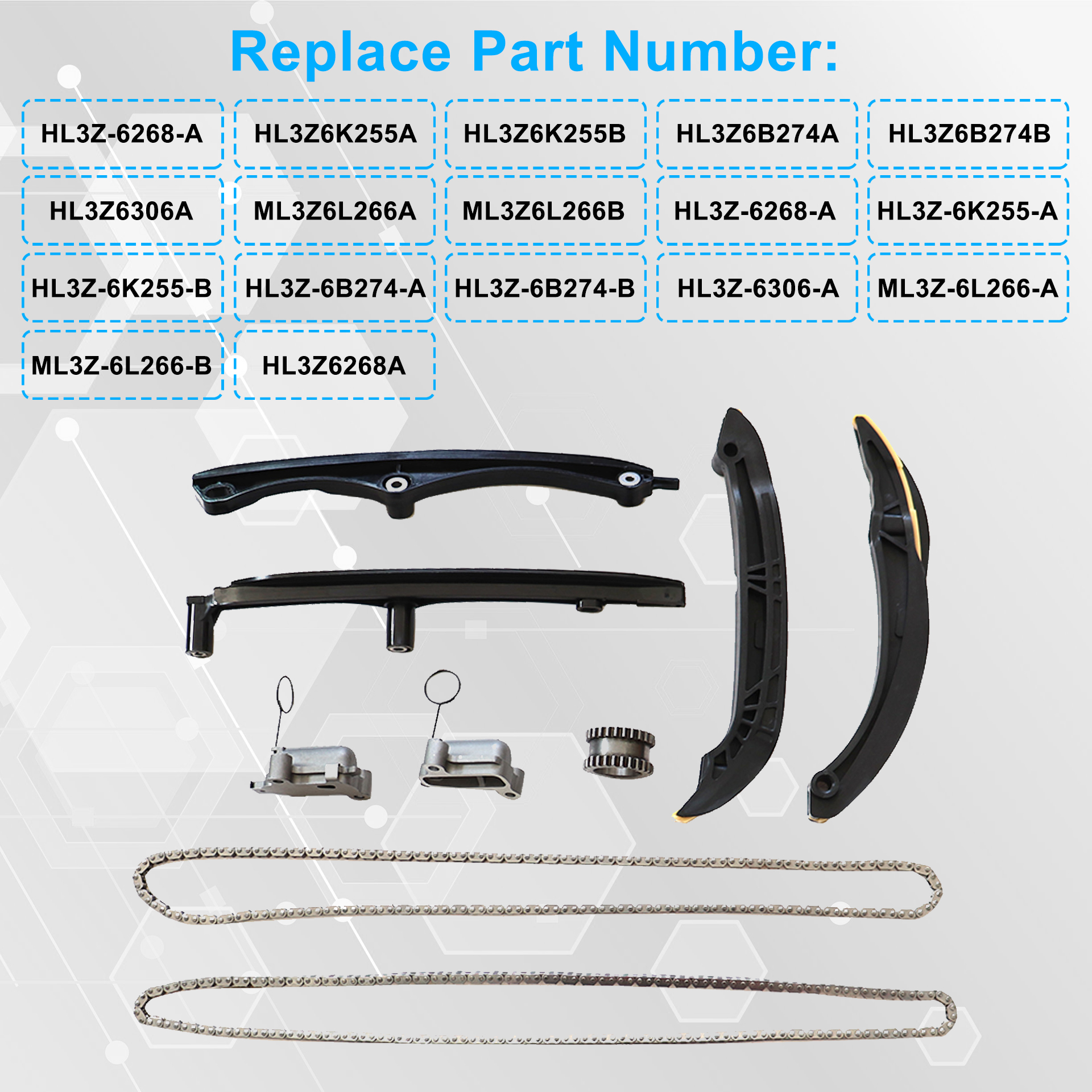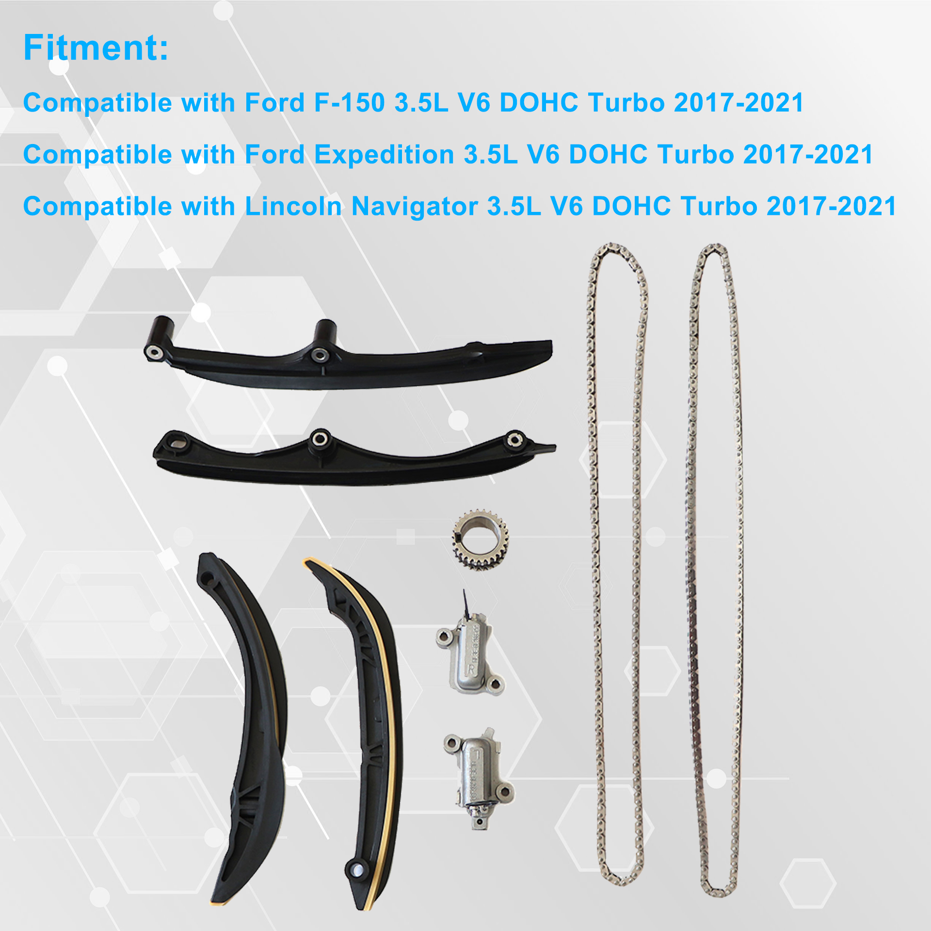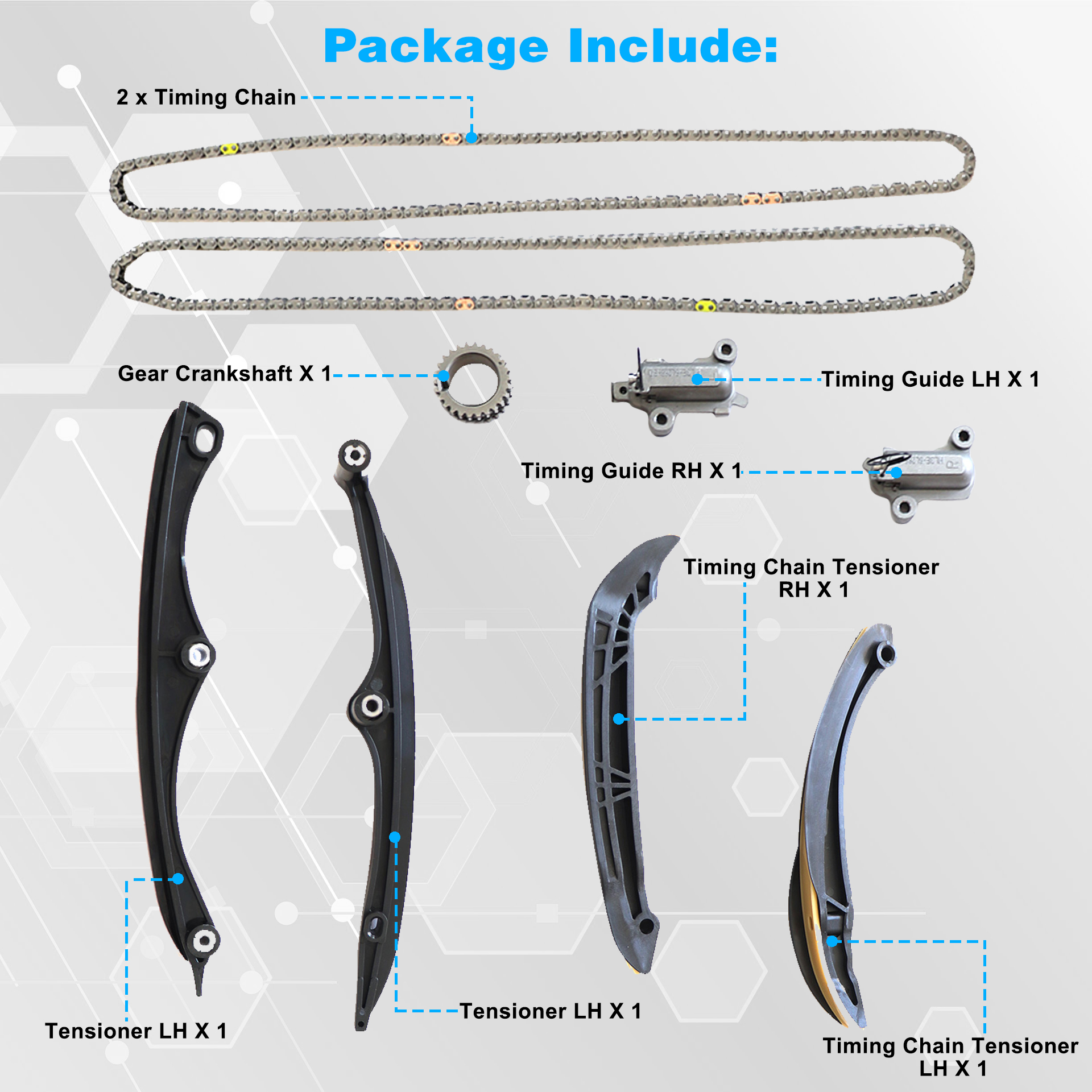 This timing chain kit is just what you need to keep your car in good running order.The parts that you will receive in this kit are high quality timing chain parts that the dealers and rebuilding shops use every day. So, do not settle for poor quality parts when it comes to engine repair.