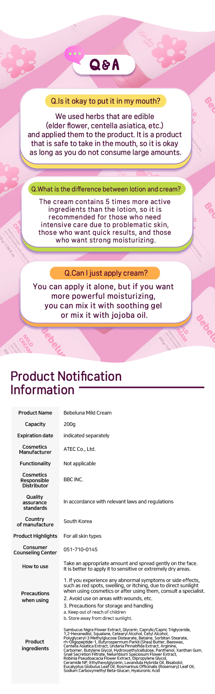 Sambucus Nigra Flower Extract, Glycerin, Caprylic/Capric Triglyceride, 1,2-Hexanediol, Squalane, Cetearyl Alcohol, Cetyl Alcohol, Polyglyceryl-3 Methylglucose Distearate, Betaine, Sorbitan Stearate, rh-Oligopeptide-1, Butyrospermum Parkii (Shea) Butter, Beeswax, Centella Asiatica Extract, Undaria Pinnatifida Extract, Arginine, Carbomer, Butylene Glycol, Hydroxyethylcellulose, Panthenol, Xanthan Gum, Snail Secretion Filtrate, Nelumbium Speciosum Flower Extract, Robinia Pseudoacacia Flower Extract, Dipotassium Glycyrrhizate, Ceramide NP, Ethylhexylglycerin, Lavandula Hybrida Oil, Bisabolol, Eucalyptus Globulus Leaf Oil, Rosmarinus Officinalis (Rosemary) Leaf Oil, Sodium Carboxymethyl Beta-Glucan, Hyaluronic Acid.