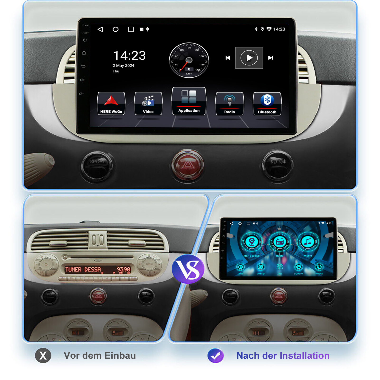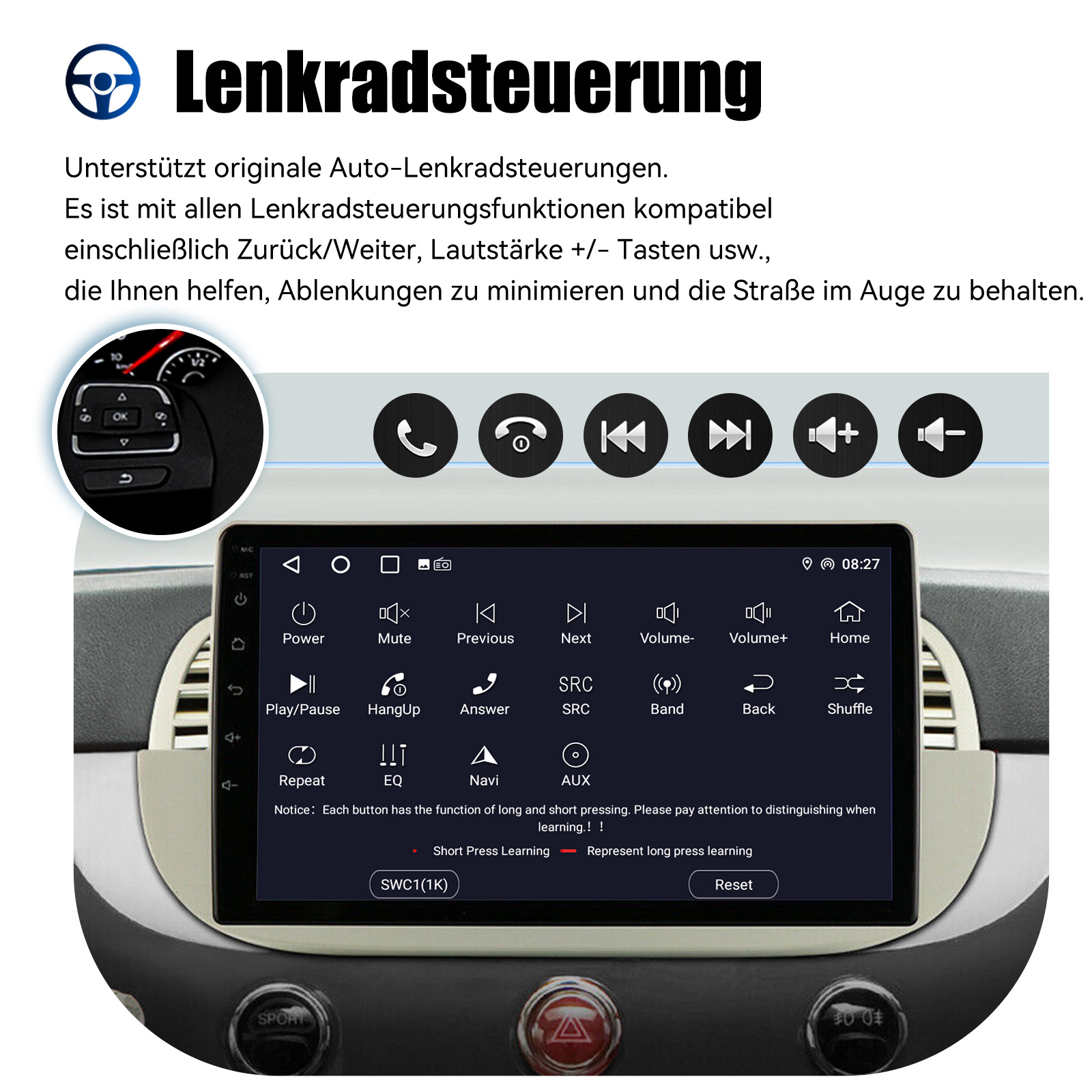 9 Zoll Android 14 Autoradio Für FIAT: Dieses Radio ist geeignet für FIAT 500 2007-2015. Das Android Autoradio mit 9" 1024* 600 HD kapazitivem Touchscreen, 2GB RAM und 64GB ROM ermöglicht das Herunterladen Ihrer Lieblings-Apps und -Videos, damit das Autofahren nicht mehr langweilig wird. Kein zusätzlicher Rahmen, kein Kabelwechsel, Plug and Play. Es wird mit Canbus geliefert und unterstützt die meisten Originalfunktionen: Lenkradsteuerung, Rückwärtssignale und Lesen von Original-Computerdaten usw.