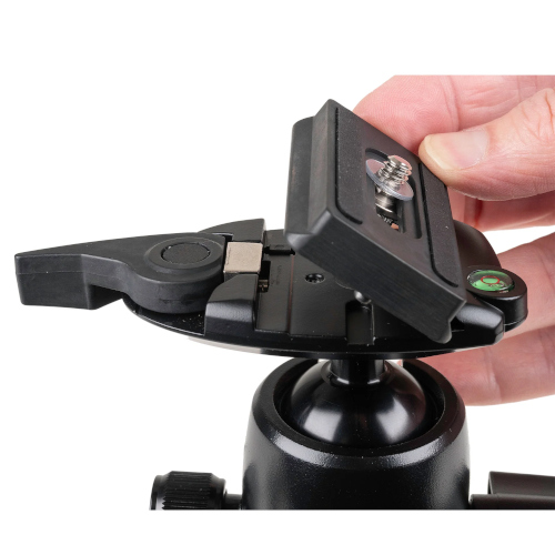 This head also features a separate pan lock that locks the ball into place while allowing the head to rotate 360 degrees. Its tension knob controls the rate of the ball’s movement. The low-profile quick release plates may be left on the camera and won’t hinder vertical shooting.