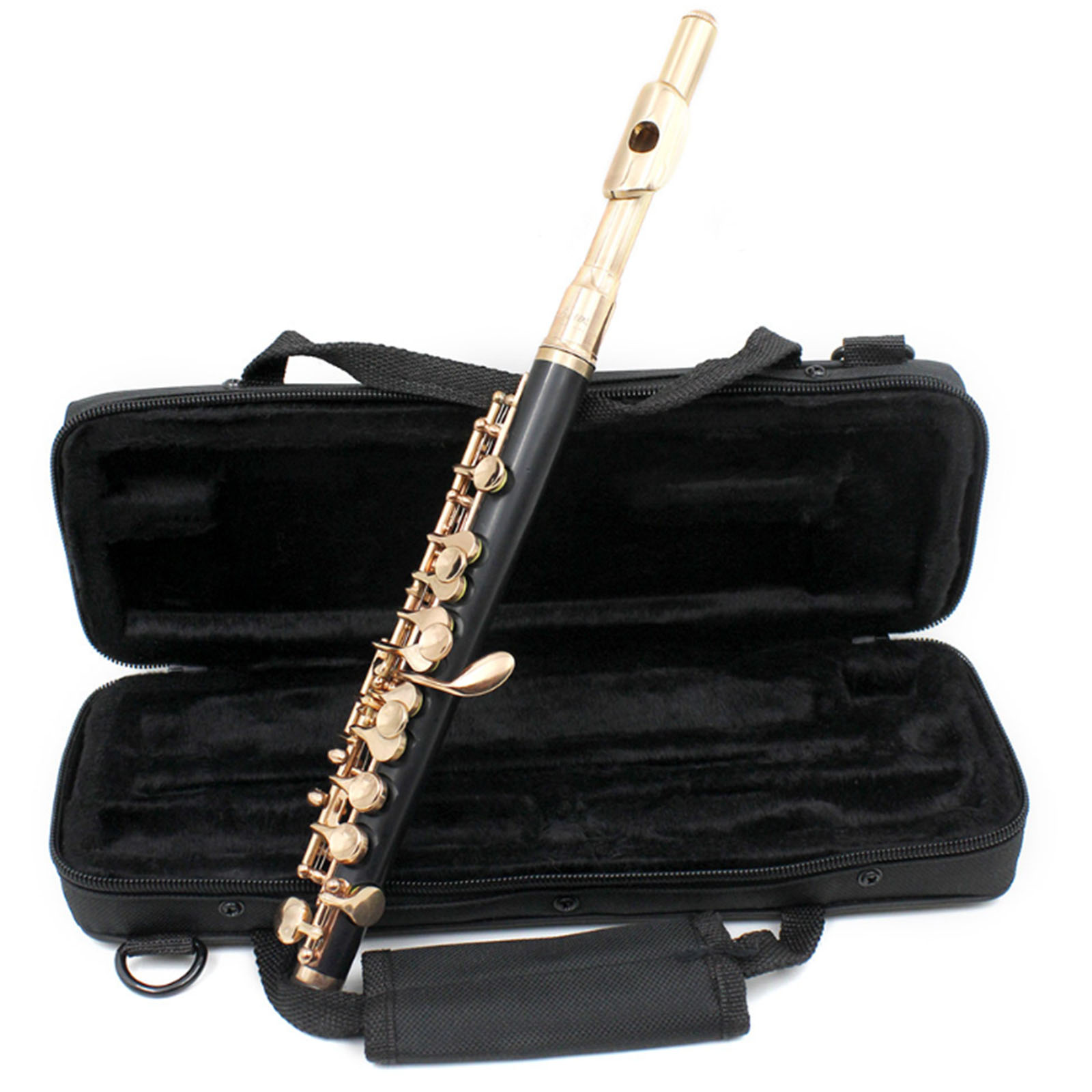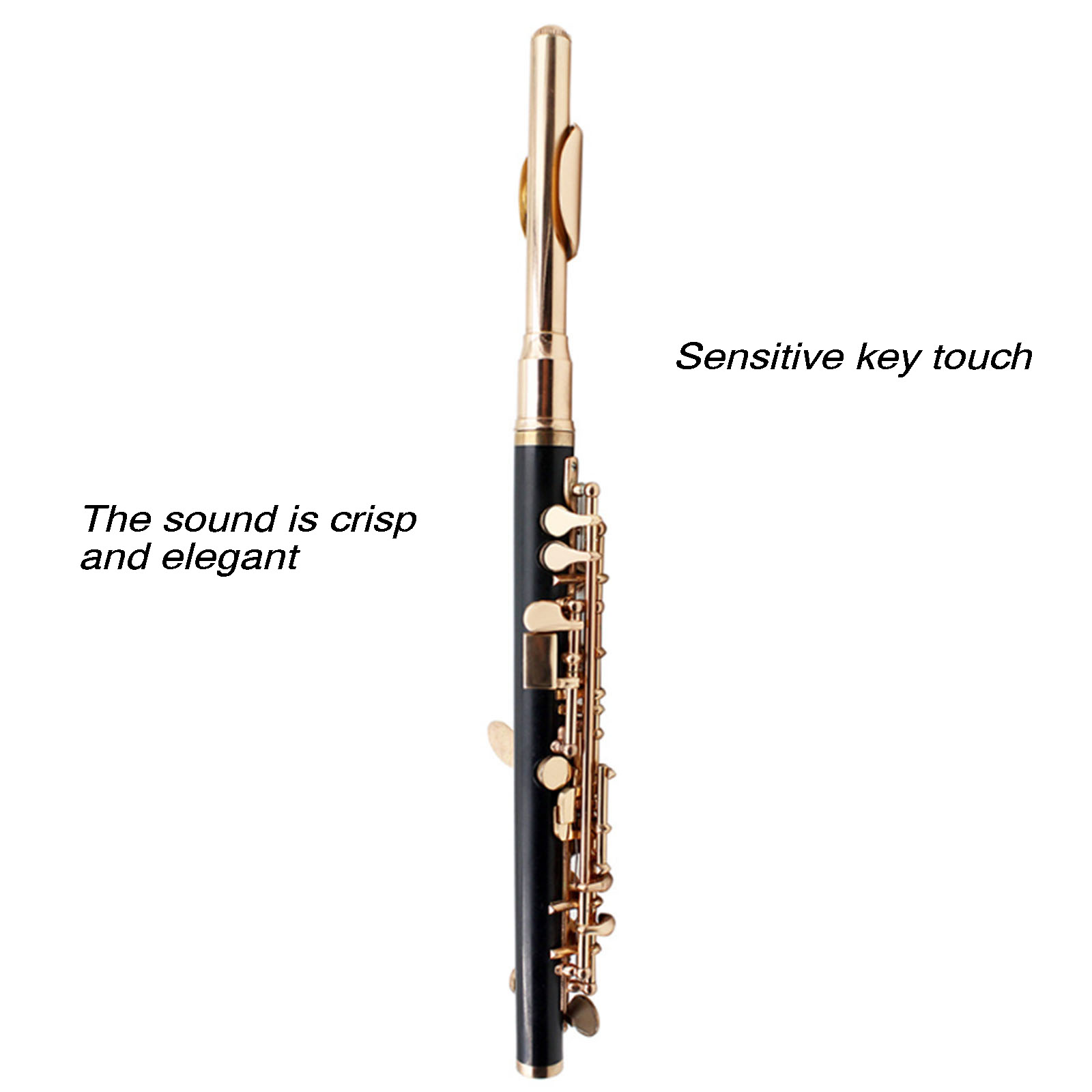 Lightweight and Portable Come with a padded box for protecting instrument and easy storage With slide buckle, the strap of the bag is adjustable, one size fits all The plated Key of C piccolo flute with bakelite tube body is designed to be lightweight and portable, making it convenient for musicians to carry and play anywhere