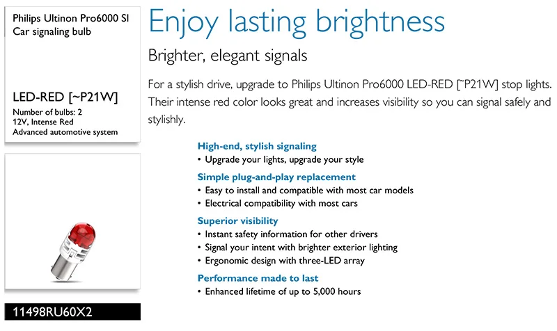 For a stylish drive, upgrade to Philips Ultinon Pro6000 LED-RED [˜P21W] stop lights. Their intense red color looks great and increases visibility so you can signal safely and stylishly.
