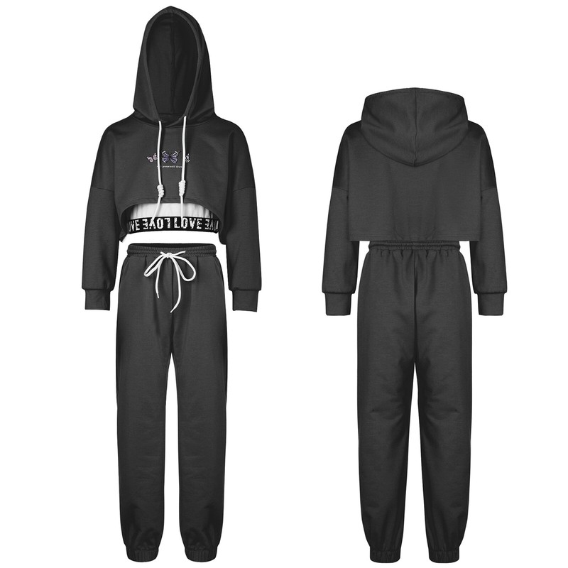 Short hooded sweatshirt, tank top and sweatpants makes girls look more energetic.
