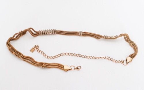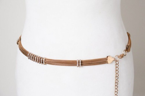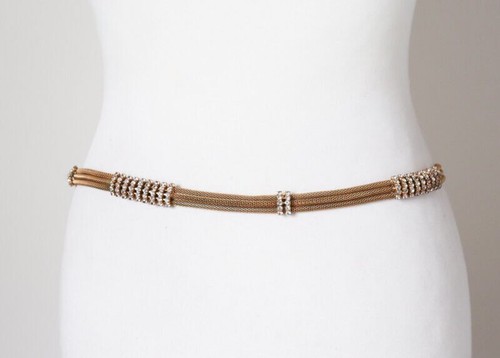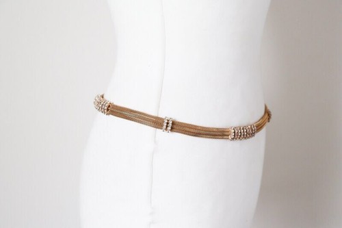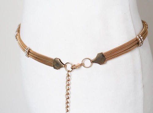 Heavy skinny gilt metal adjustable chain belt trimmed with rhinestones.