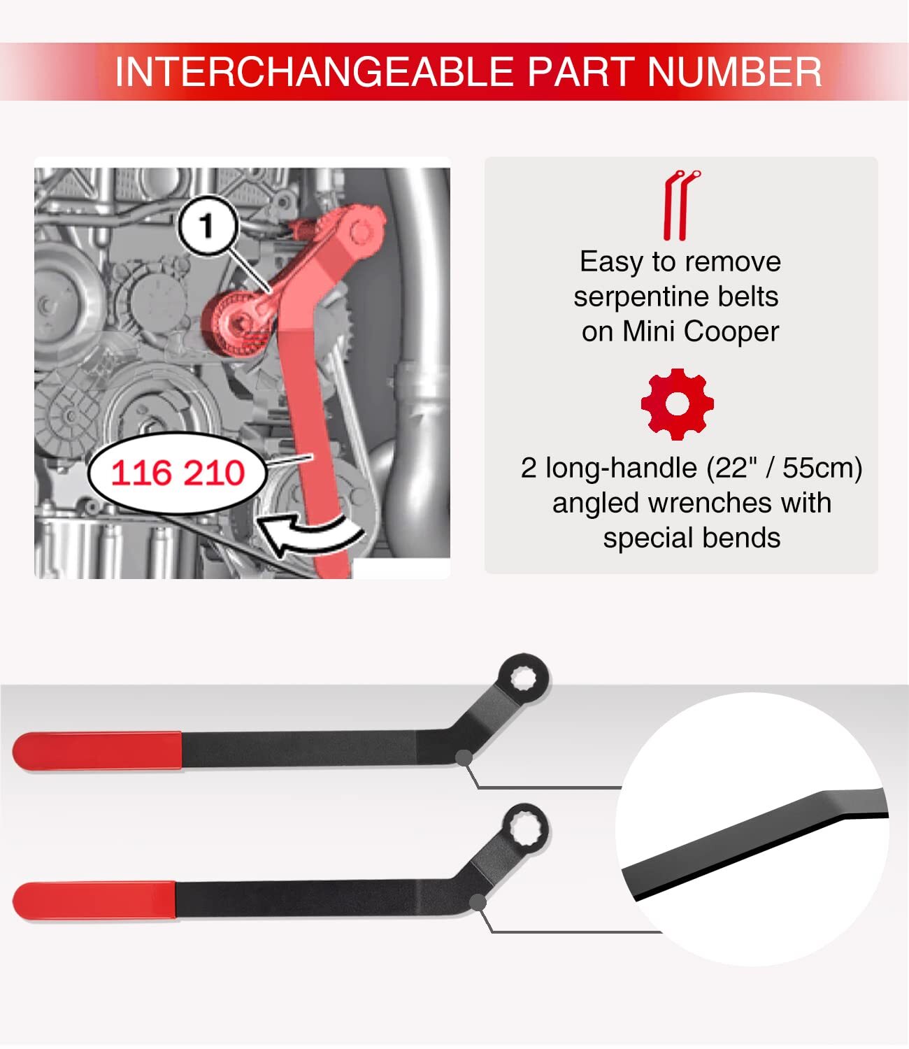 • 【Great Compatibility】 2 long-handle (22" / 55cm) angled wrenches with special bends to service serpentine belts on 2007+ Model Mini Cooper N12, N14, N16 & N18 Engines. Also suitable for Mini Cooper R50, R52, R53, R55, R56, R57, R58, R59, R60, R61 with N12, N14, N16 & N18 engines. Comparable to Factory Tool #116210 / 1016.
