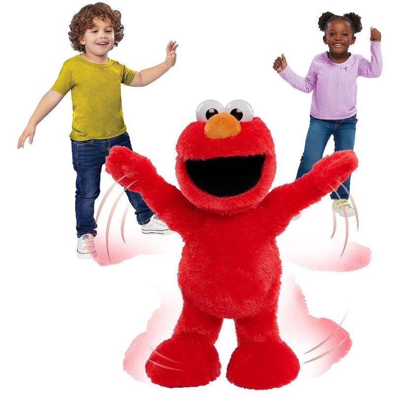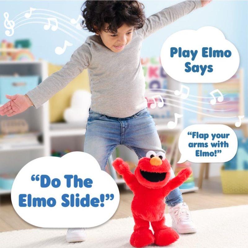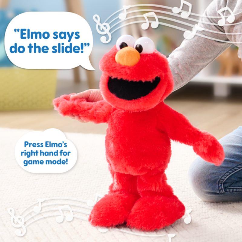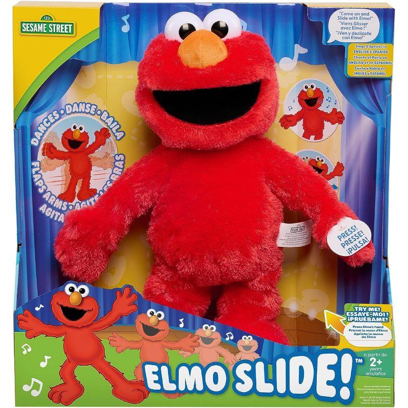 Description: It's time to do the Elmo Slide! With the Sesame Street Elmo Slide interactive plush toy, little ones can dance, sing, and play along with their fun-loving pal, Elmo, in English or Spanish. The music and motion start with a squeeze of Elmo's left hand. This 14-inch Elmo plushie sings, sways, flaps his arms, and glides from side to side to the super-catchy Elmo Slide song. It's so much fun, that kids—and grownups—won't be able to sit still when Elmo prompts them to dance with him. Fun for the whole family.