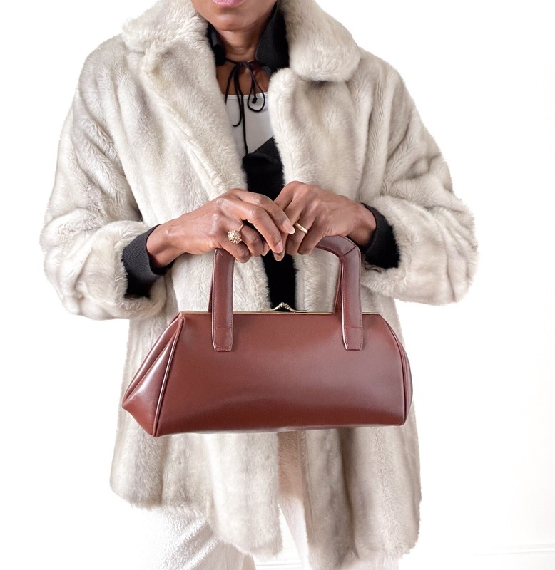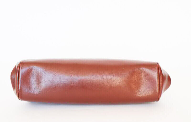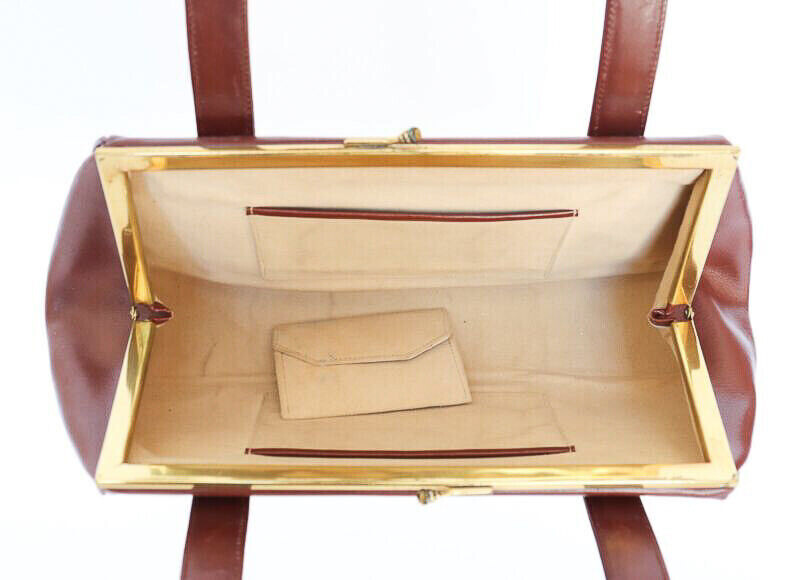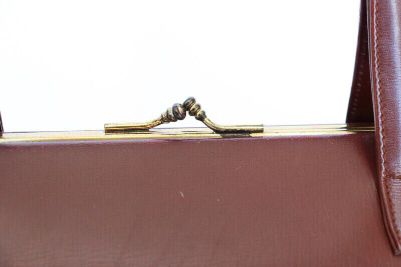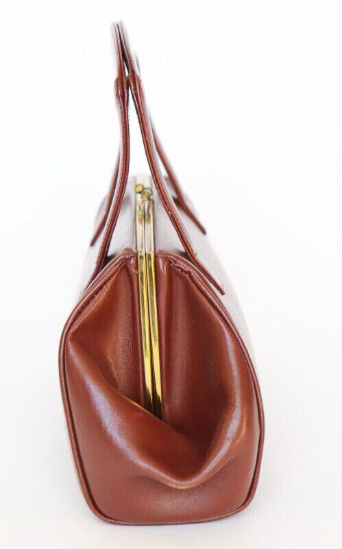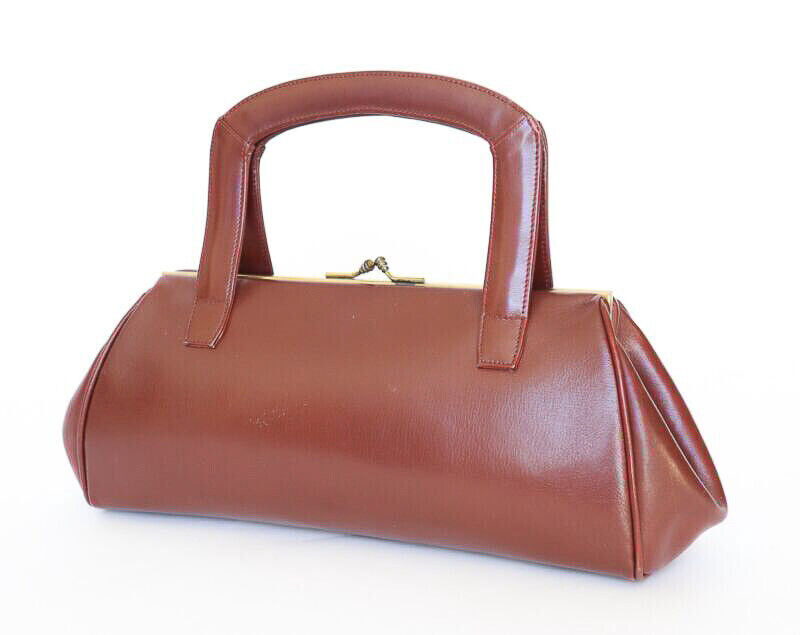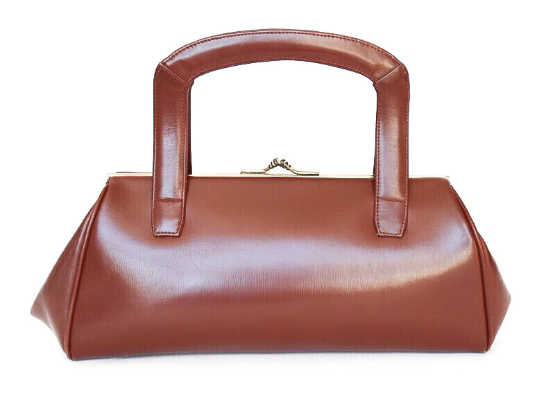 Original 1950's medium sized, long shaped handbag in top quality chestnut brown leather. The bag is lined with pale suede and secures firmly with a metal purse clip closure.