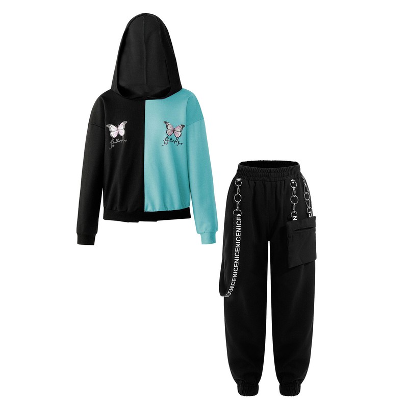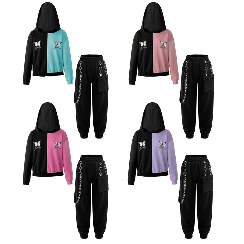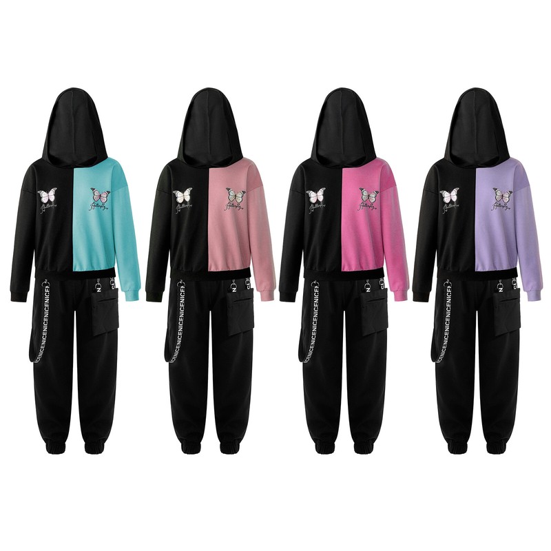 A crop sweatshirt for girls, designed with hood, long sleeve, butterfly print and contrast color.