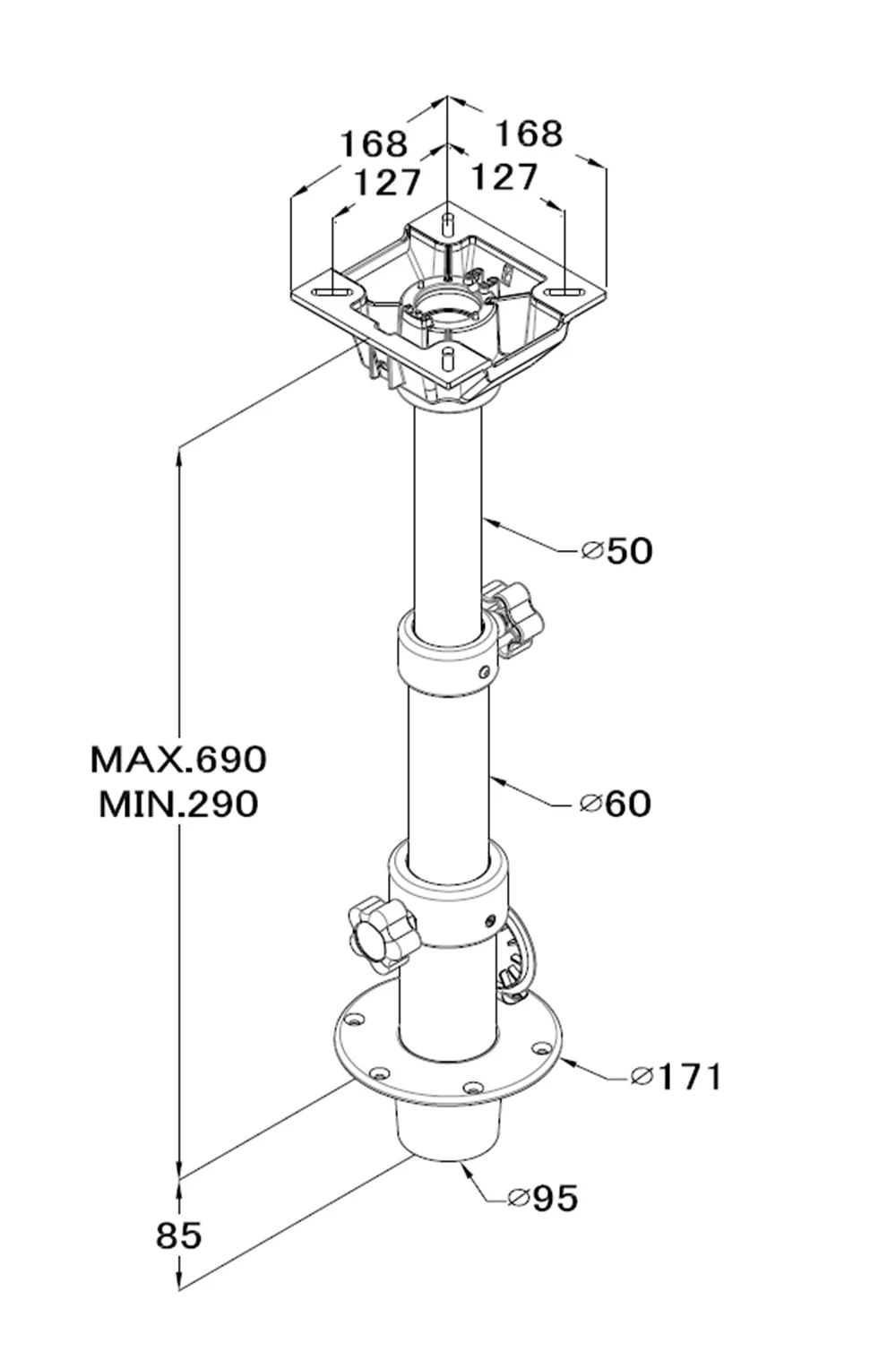 Socket style pedestal bottom base is 171mm (6.7 inch) diameter, with 95mm (3.7 inch) diameter tube and 85mm (3.3 inch) height