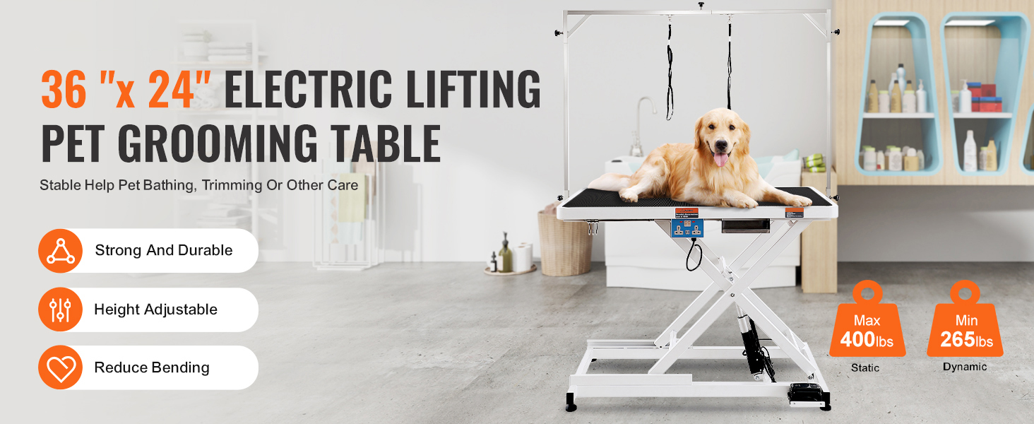 This grooming table for pets is designed with practical features: sturdy metal hooks for organizing tools, dual straps to keep pets securely in place, a built-in outlet for connecting a dryer, and a broader, rounded tabletop edge to enhance safety and usability.