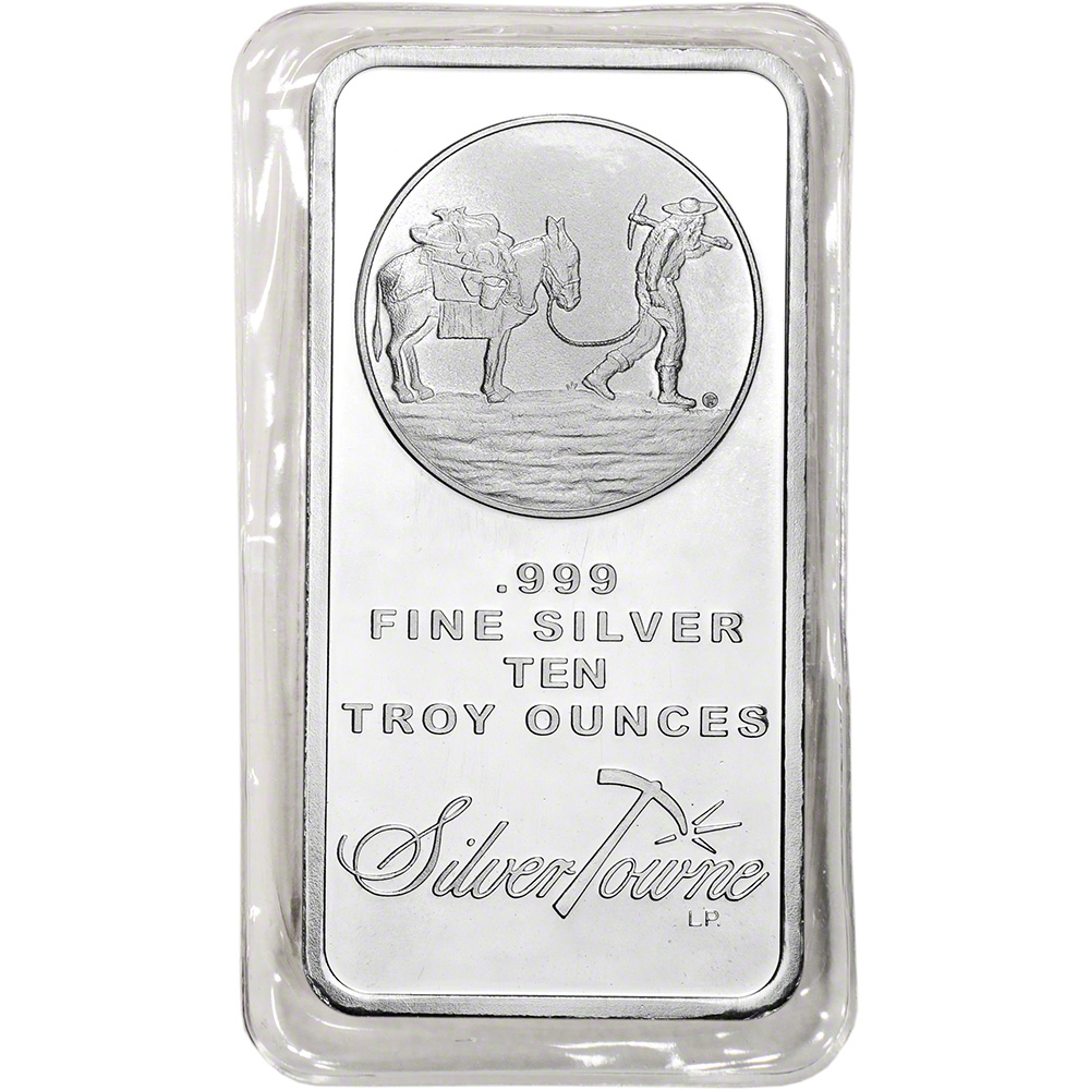 The obverse features the trademark image of the Prospector and Donkey and includes SILVERTOWNE, .999 FINE SILVER and TEN TROY OUNCES.