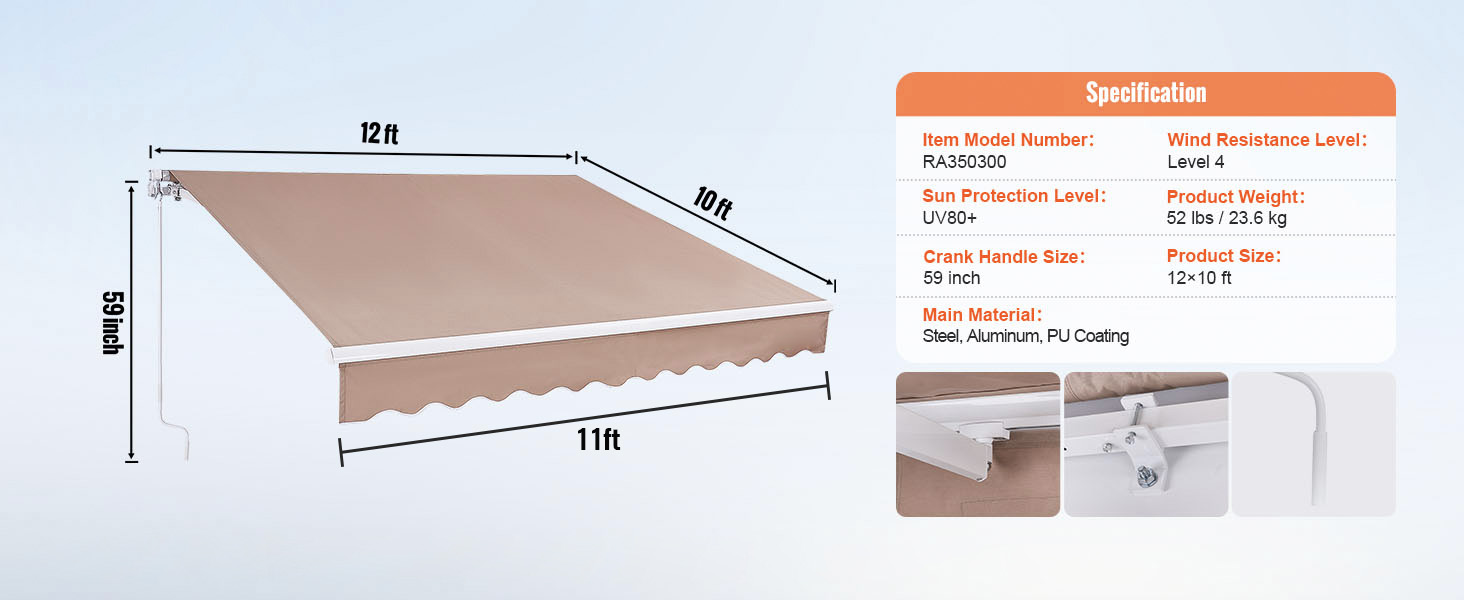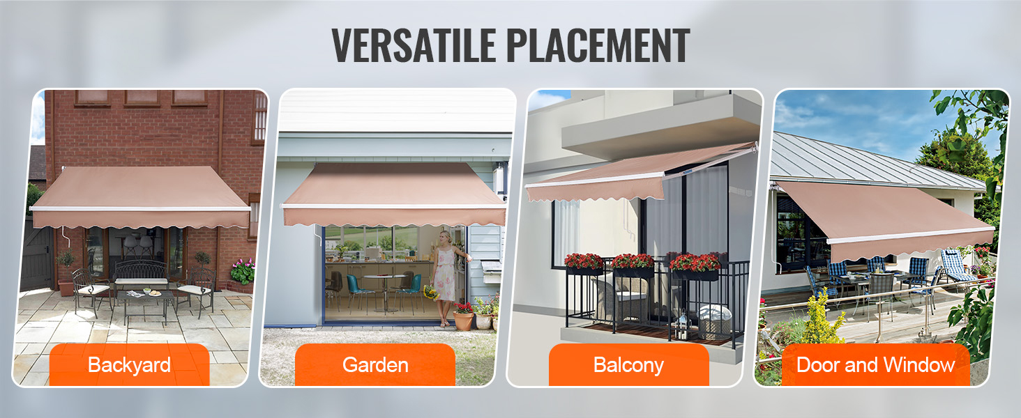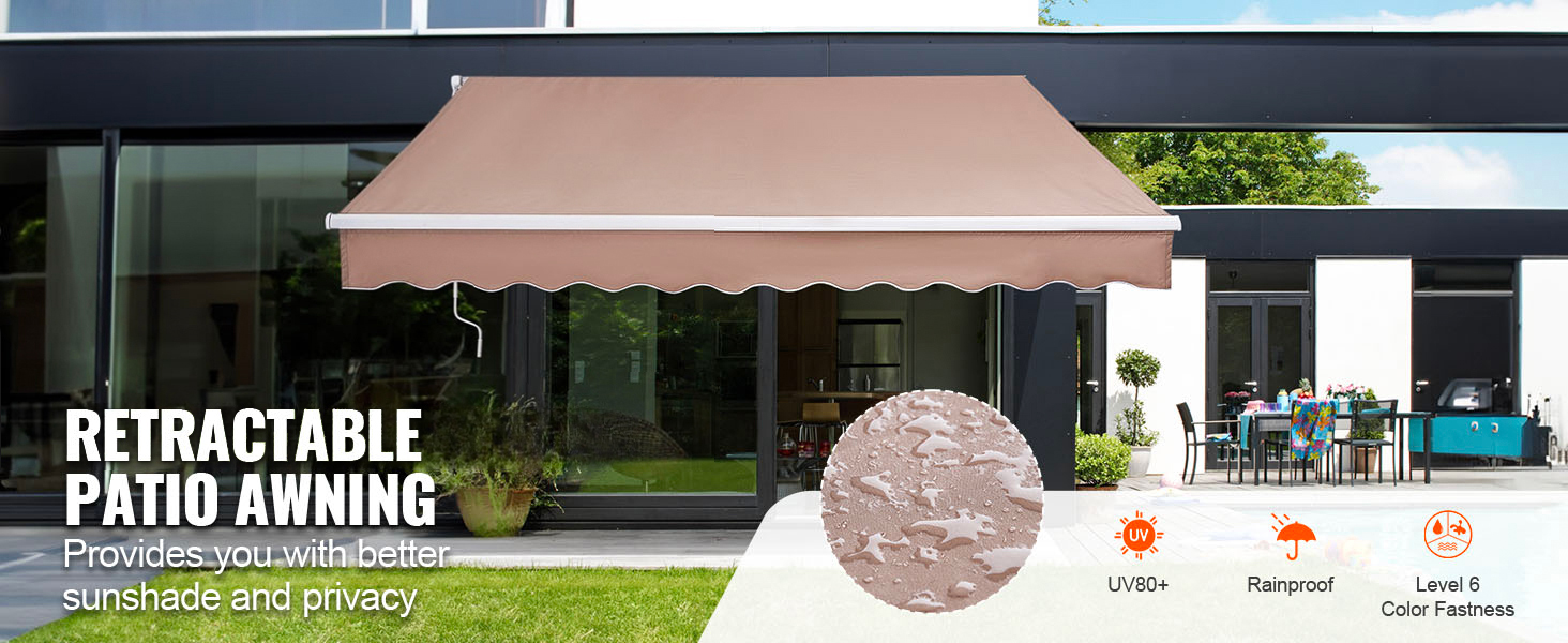 Sunshade for Rain or Shine: Tired of scorching summers? Our 12x10 ft patio awning retractable has you covered. With a 280g polyester canopy and a waterproof PU coating, featuring a UV80+ rating, it shields you from UV rays and keeps you dry. It boasts colorfastness, durability, and is perfect for relaxing in your yard.