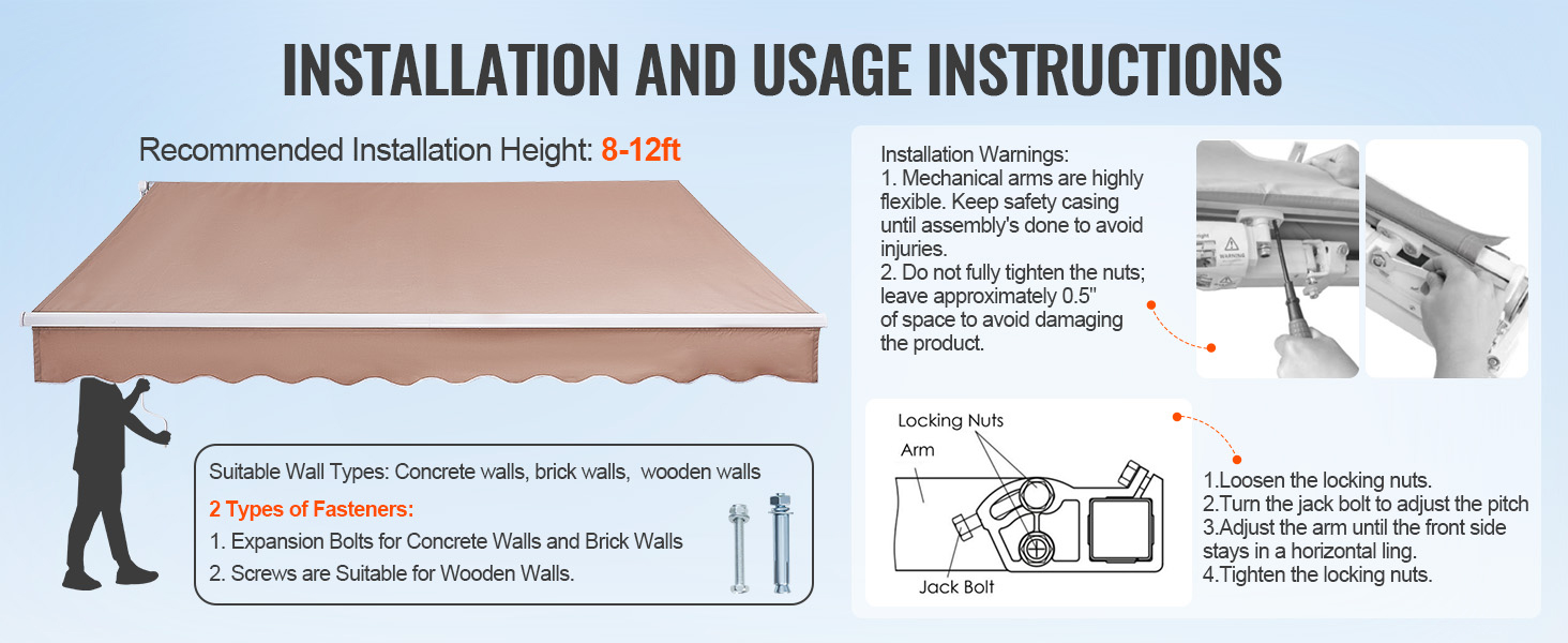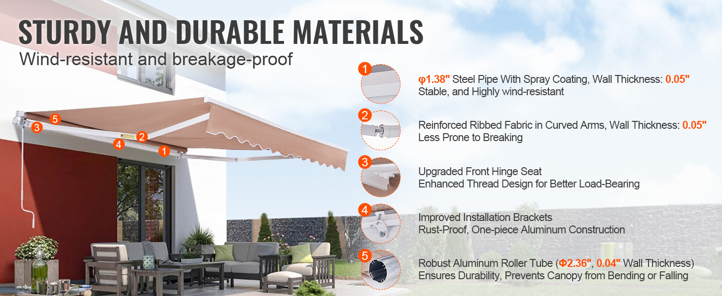 Built to Last: This manual retractable awning features robust steel tube supports with enhanced durability and wear resistance. The connections are secured with screws for added stability and wind resistance (up to 4th level). The thickened aluminum top tube ensures the awning remains taut and prevents fabric sagging. We recommend retracting it during storms to prolong its lifespan.