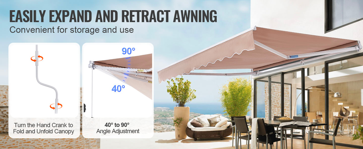 Easy Angle Adjustment: Simply turn the crank handle to adjust the awning sunshade shelter's angle from 40° to 90° for versatile shade in any weather. The operation is effortless and convenient.