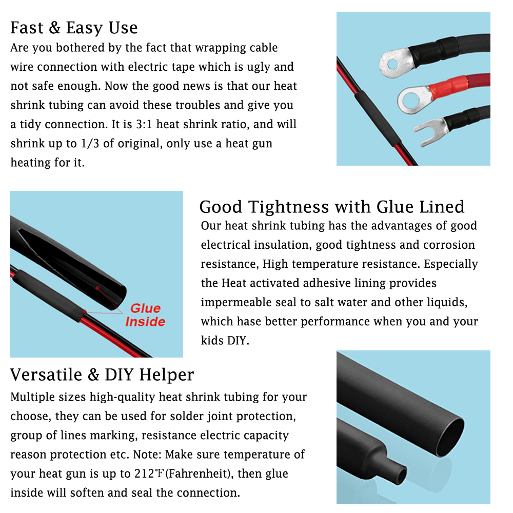 [Versatile and DIY Helper]: High-quality heat shrink tubing, they can be used for solder joint protection, group of lines marking, resistance electric capacity reason protection etc. Note: Make sure temperature of your heat gun is up to 212℉(Fahrenheit), then glue inside will soften and seal the connection.
