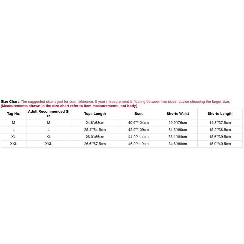 | Tag No. | Adult Recommended Size | Tops Length | Bust | Shorts Waist | Shorts Length |