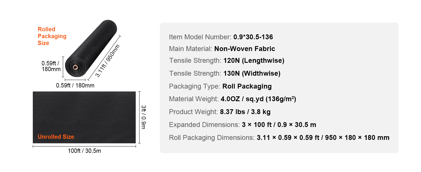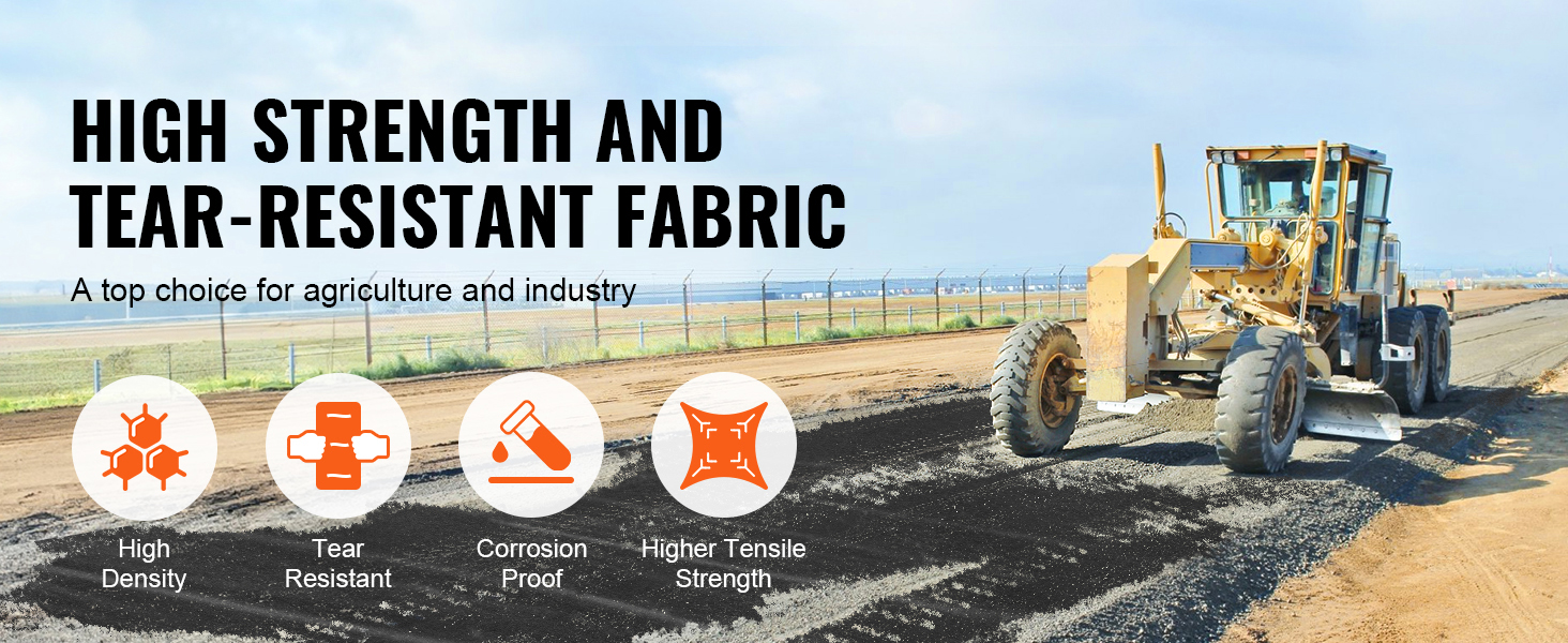 Say goodbye to stubborn weeds! VEVOR 3 x 100 ft, 4OZ high density weed barrier landscape fabric boasts exceptional permeability and breathability, while offering resistance to tear, corrosion, and erosion. It enhances soil health by controlling weed growth, protecting garden with confidence.