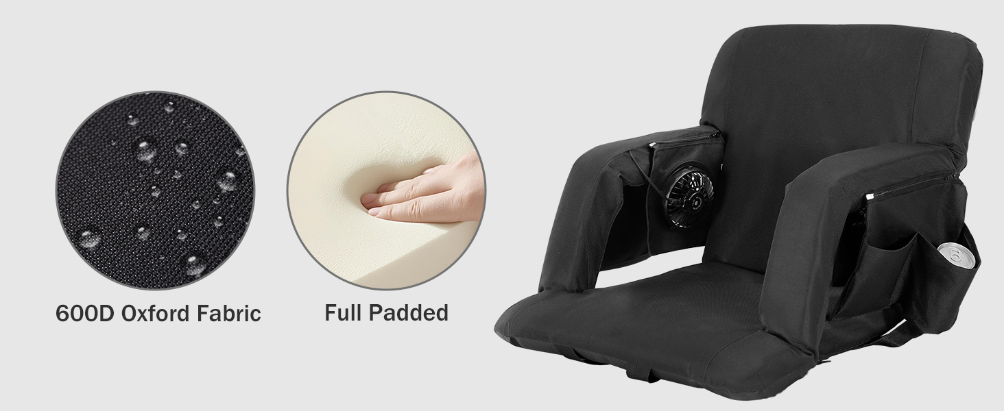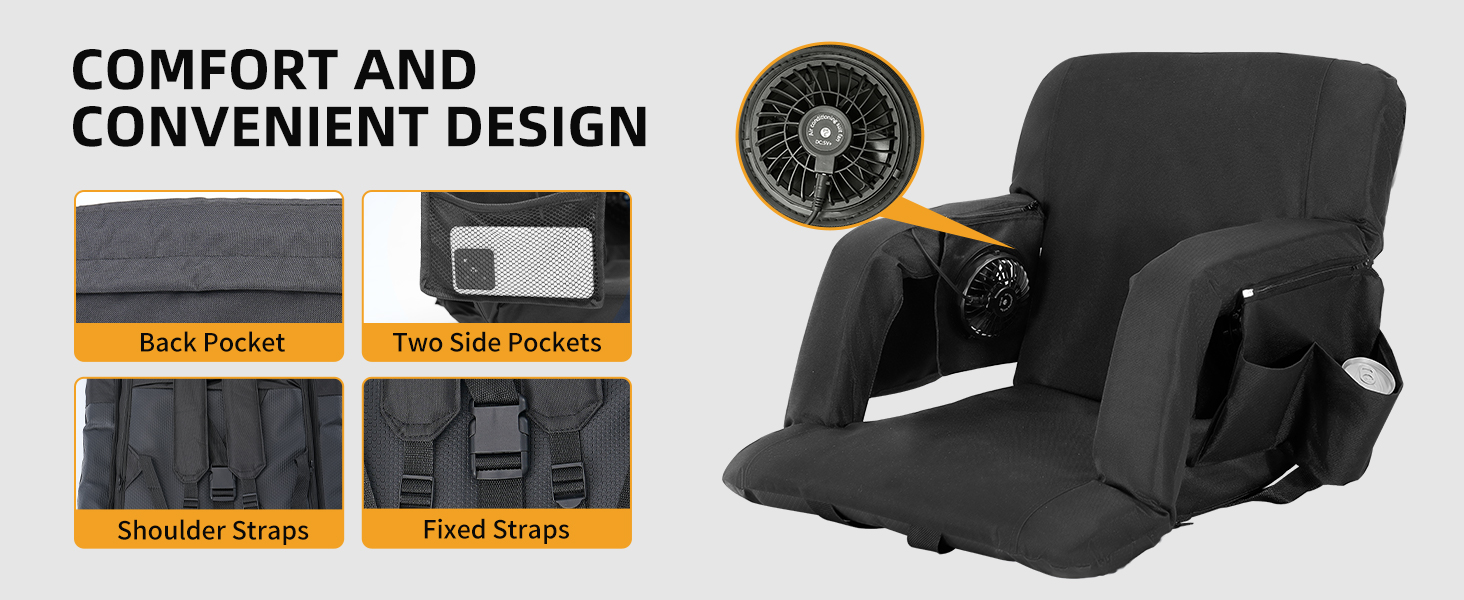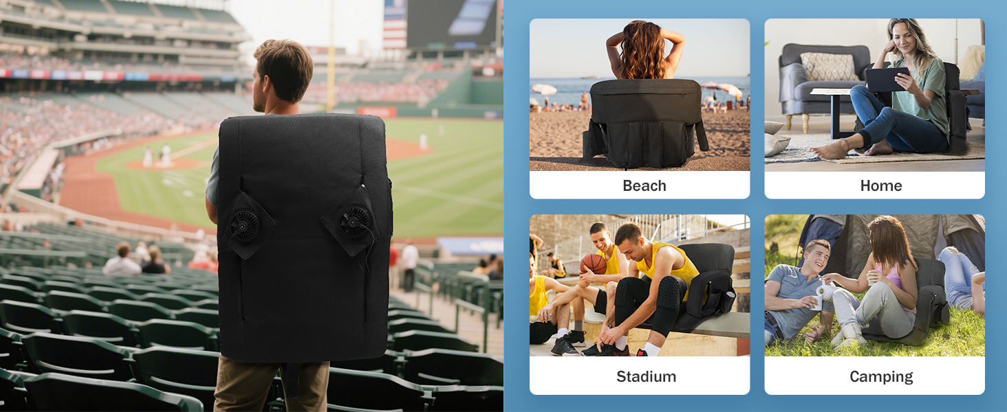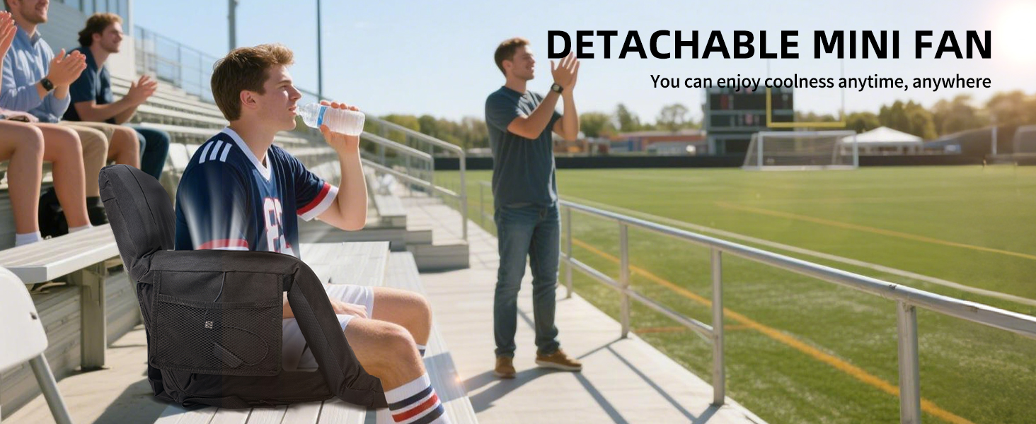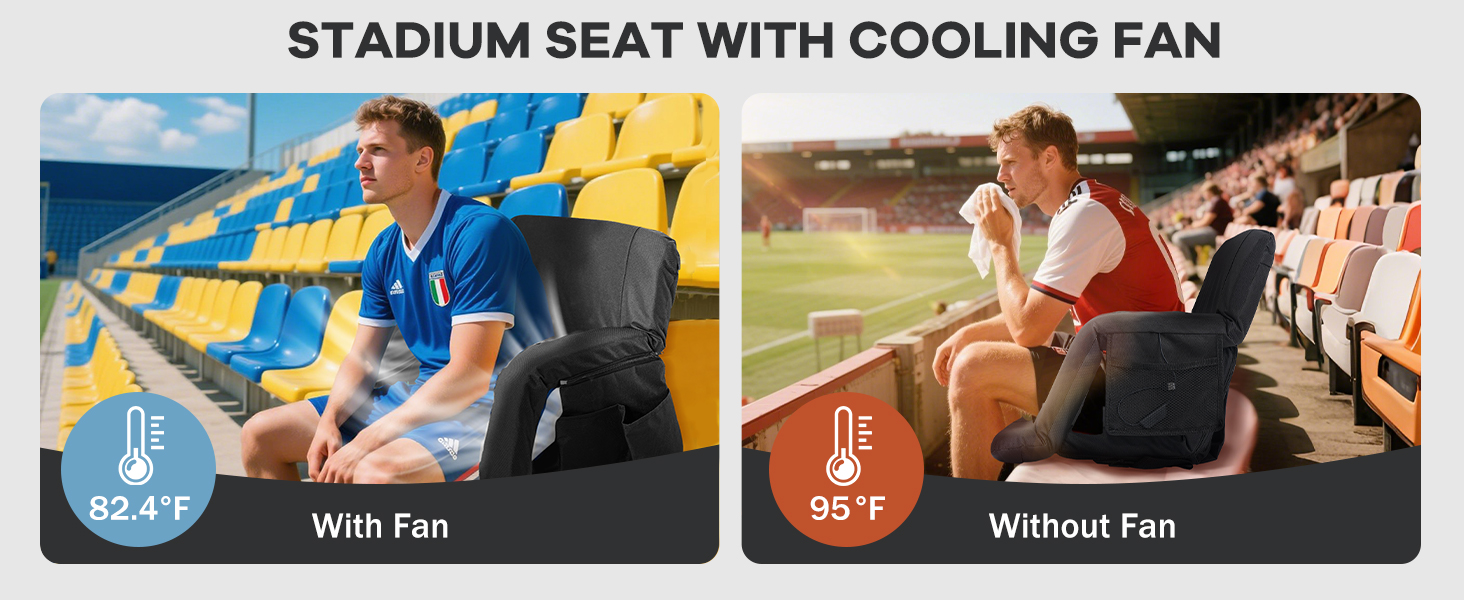 Adjustable 5 Tilt Angles: the stadium seats with back support and fan can be laid flat 180 degrees, and there are also 5 adjustable tilt angles, you can choose the most comfortable angle; The seat cushion size is 15.7 x 15.7 inches, , and the thickened cooled portable seat allows you to enjoy sports events all day without back pain and heat
