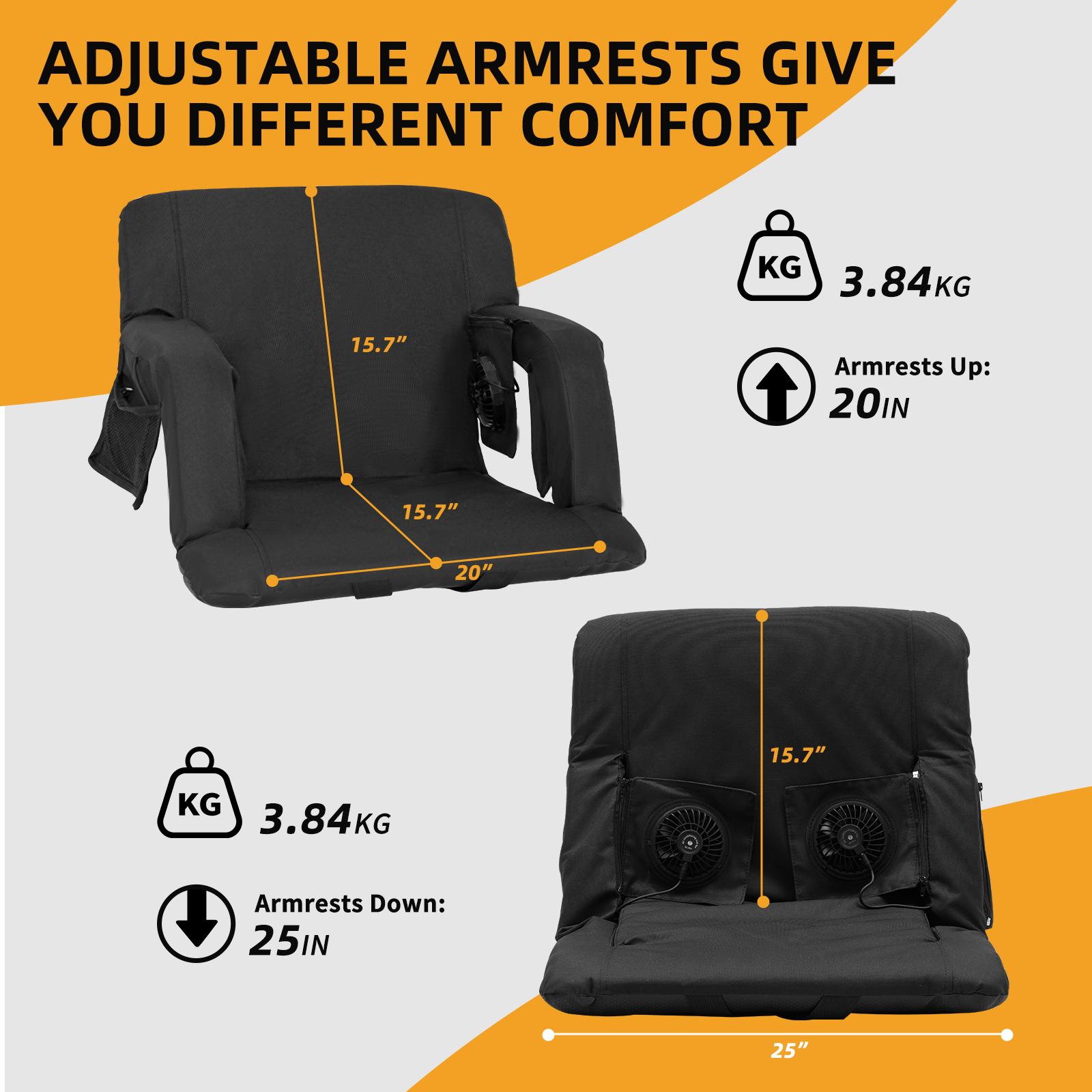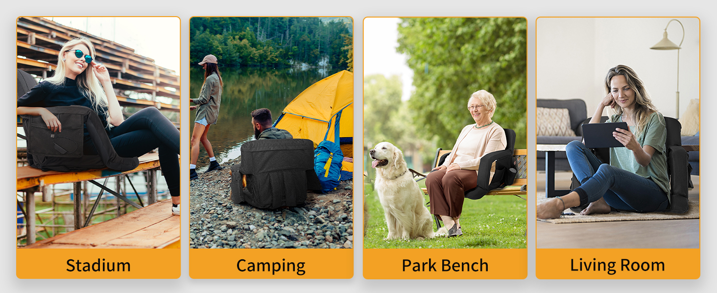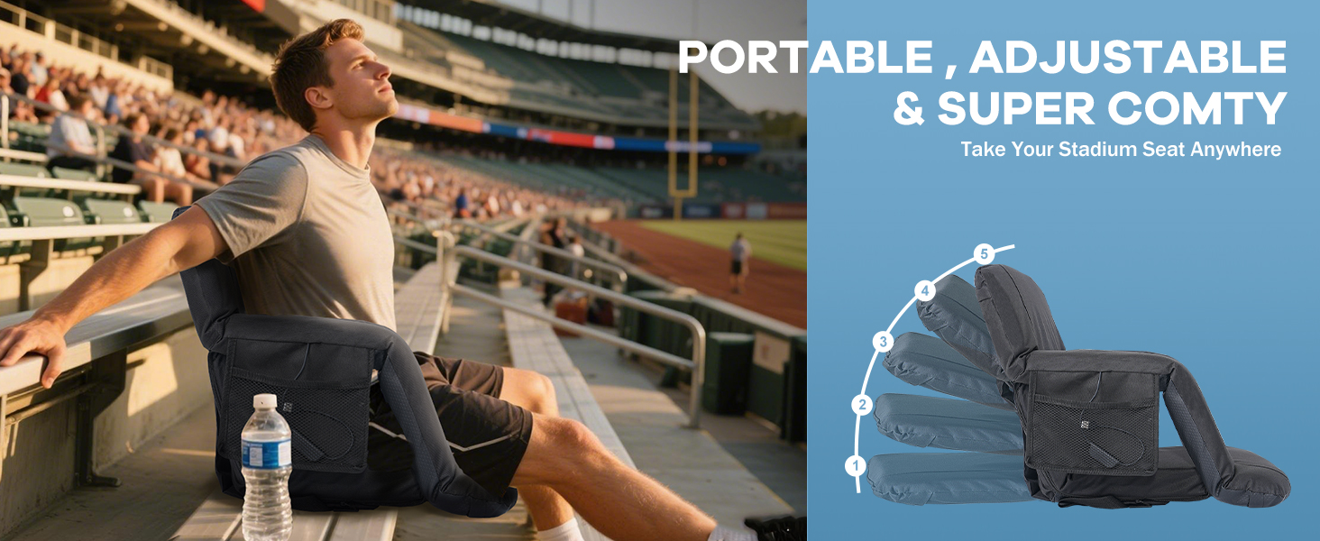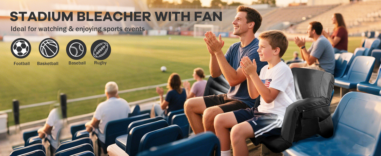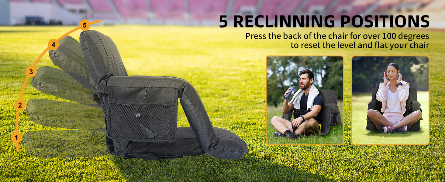 Adjustable 5 Tilt Angles: the stadium seats with back support and fan can be laid flat 180 degrees, and there are also 5 adjustable tilt angles, you can choose the most comfortable angle; The seat cushion size is 15.7 x 15.7 inches, , and the thickened cooled portable seat allows you to enjoy sports events all day without back pain and heat
