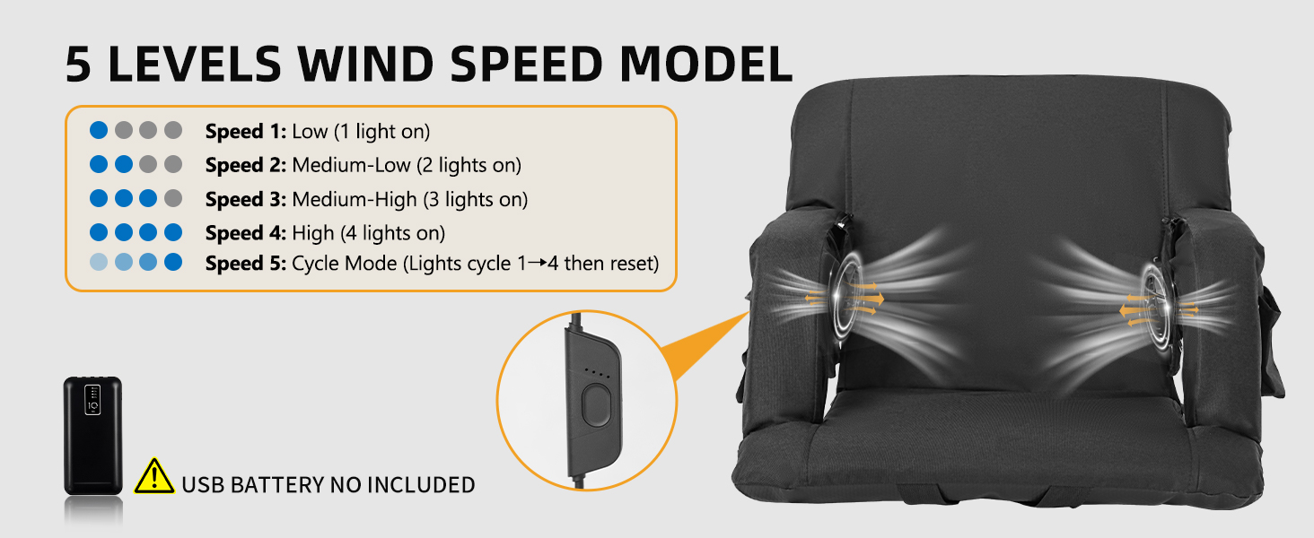 5 Level Cooling Seats: our cooled stadium seats with fan can adjust the air volume, providing flexibility and energy saving; Use a USB power bank to select the most comfortable temperature from five blowing cooling levels, enjoy hours of coolness, and stay cool and comfortable even in hot weather (power bank not included)