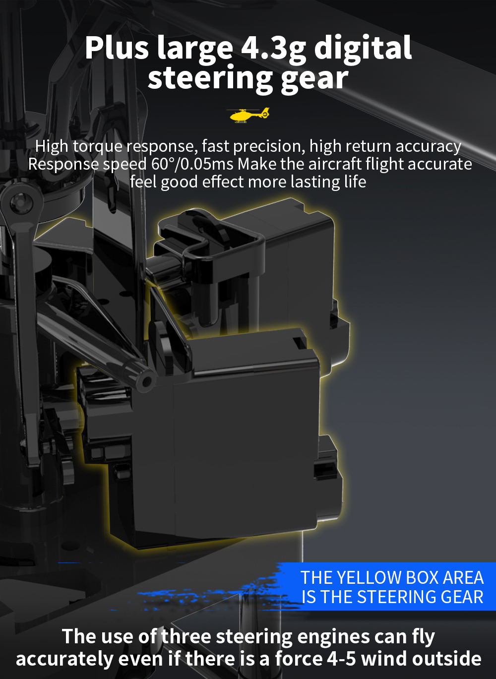 6. Using a larger 4.3g digital servo, it has the characteristics of high torque response, fast precision, high return to center precision, and a response speed of 60 °/0.05ms, making the aircraft fly accurately, with good tactile effect and longer lifespan. By using three servos, precise flight can be achieved even with wind speeds of 4-5 levels outdoors.