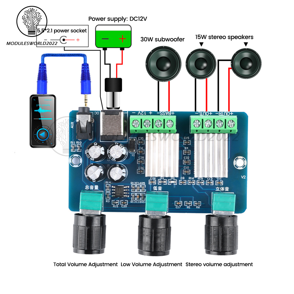 3. Dual-channel output, output impedance of 4 Ω, output power of 2 * 15W + 30W