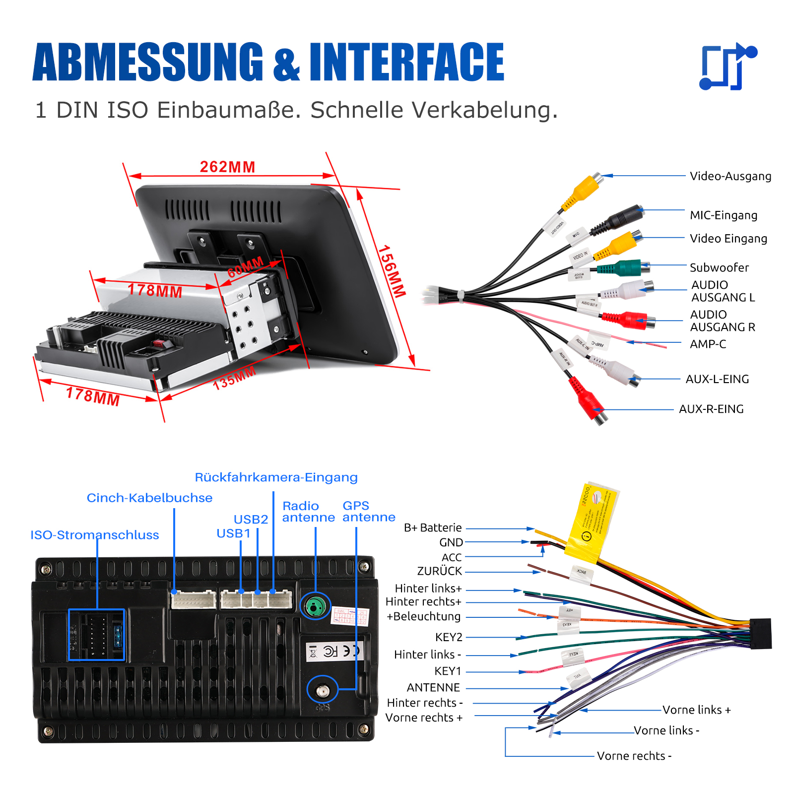 Kapazitiver 10,1-Zoll-HD-Touchscreen (1024 x 600):Dieses Autoradio mit 1024 x 600, 4 GB RAM + 64 GB ROM, 10,1-Zoll-IPS-Touchscreen (Bildschirm kann um 360 ° gedreht werden) unterstützt 1080P HD-Videowiedergabe für hervorragende Sicht, mehrere gut gestaltete Benutzeroberflächen verfügbar für Ihre beste Wahl für ein Autoradio. Die Installationsgröße des Radios beträgt 178 x 50 mm, die Bildschirmgröße 262 x 156 mm. Stellen Sie sicher, dass die Größe Ihres Armaturenbretts größer als die Radiogröße ist.