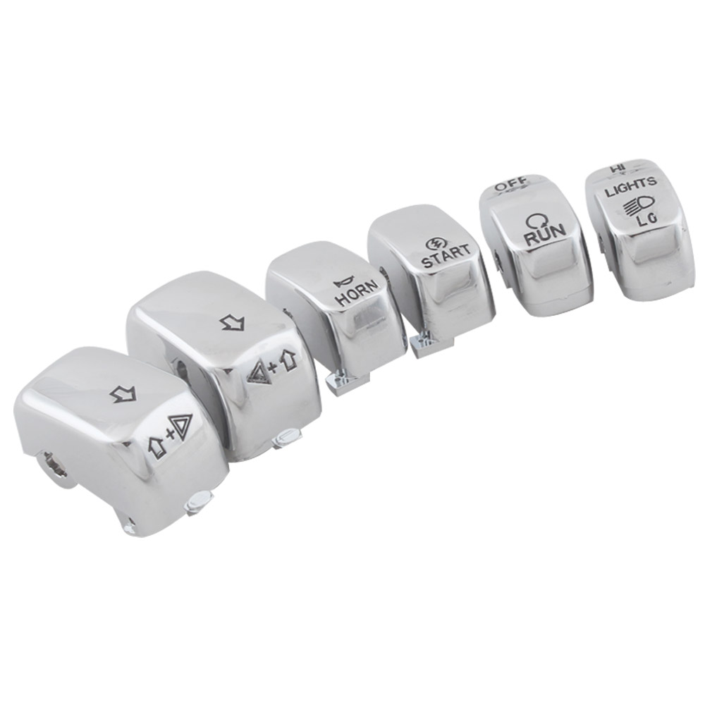 The chrome switch caps complement other chrome hand control accessories (Chrome Master Cylinder Kit, Chrome Hand Levers, Chrome Switch Housings and Chrome Master Cylinder Cover) to complete the custom look.
