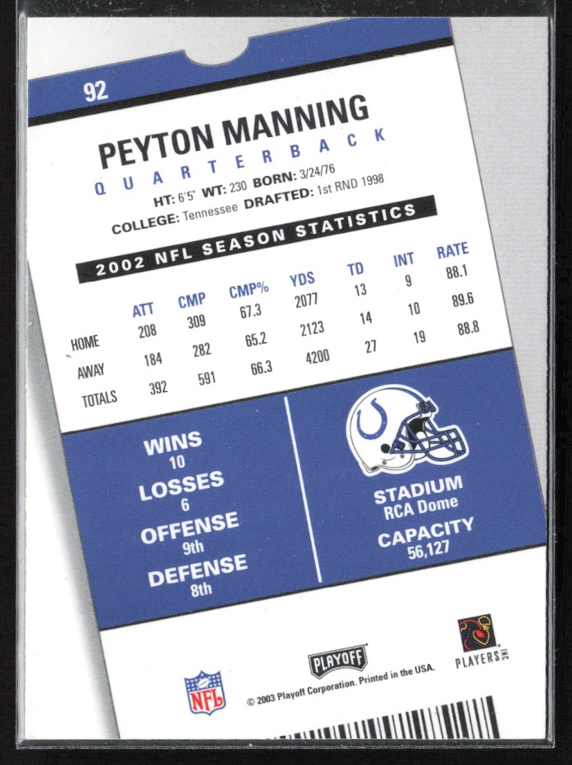 | 2003 Playoff Contenders Peyton Manning Indianapolis Colts #92 | ||||||||||||||||
