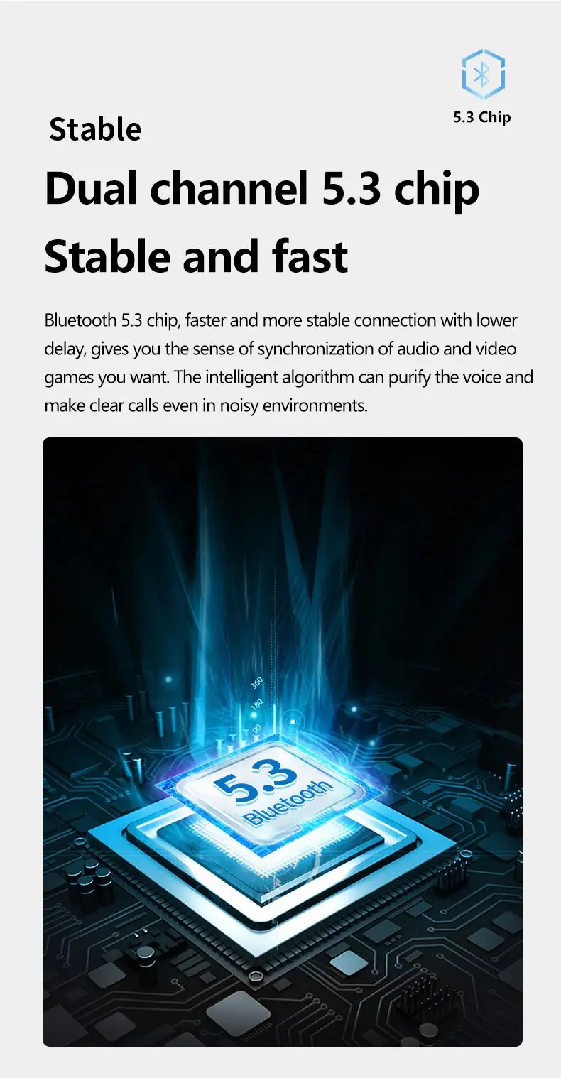 Connect Fast and Low Latency:Bluetooth 5.3 ensure that the headphones connects quickly and stably within 15 meters, with lower latency and lower power consumption.