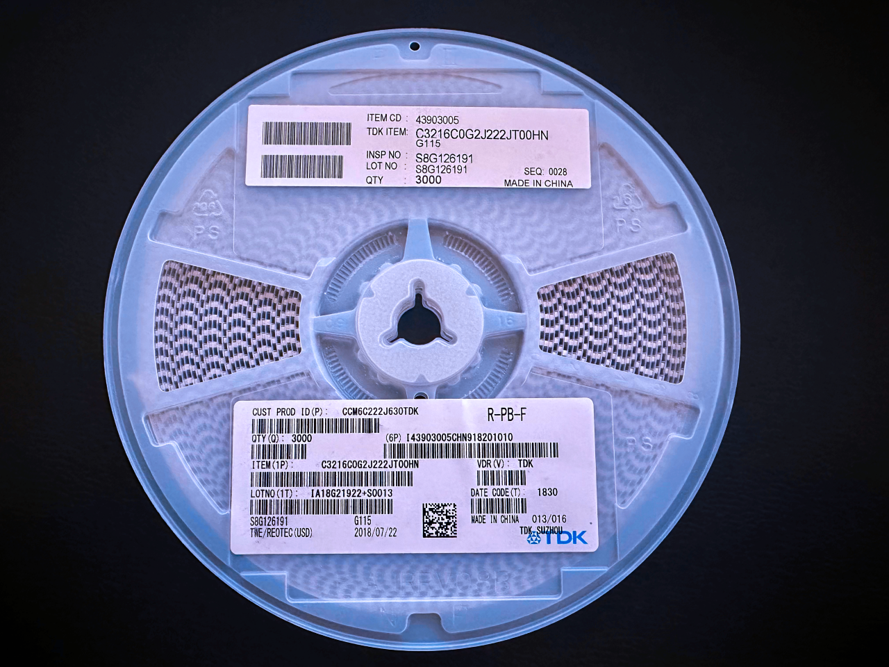 Full Reel of 3000 Pcs - C3216C0G2J222JT00HN TDK MLCC Capacitor SMD 2200pF 630V C0G (NP0) 1206 (3216) ±5%